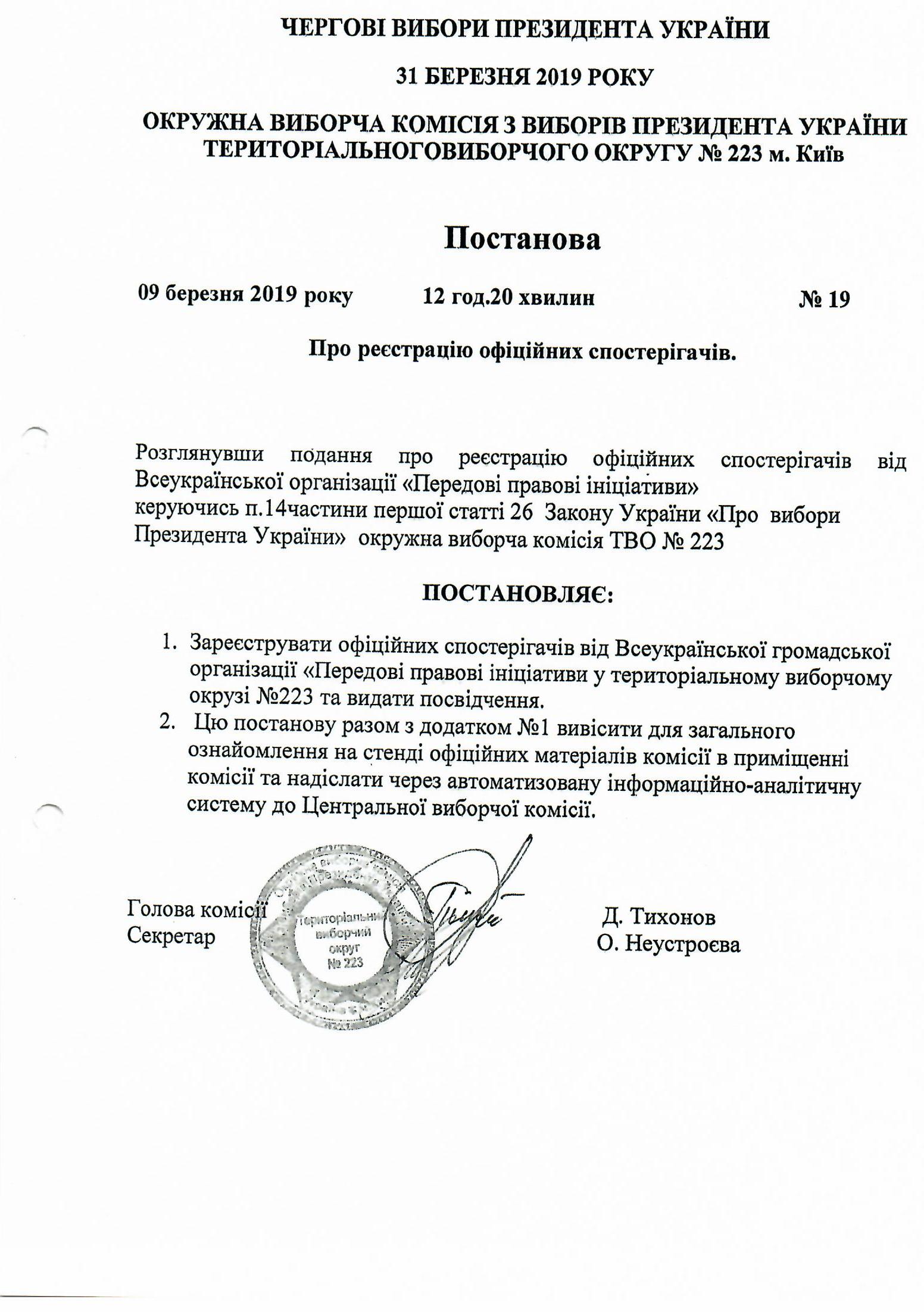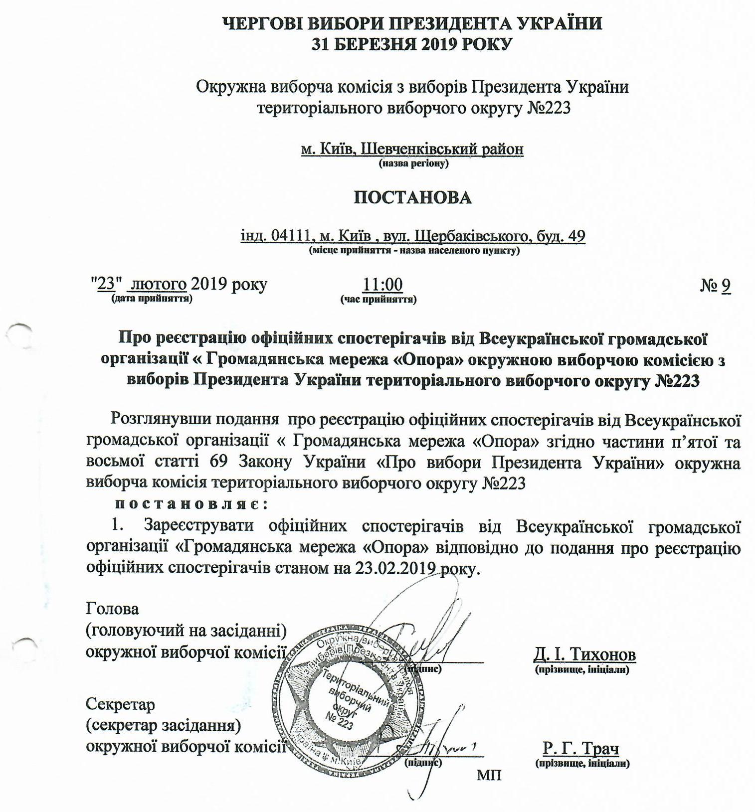 Про реєстрацію офіційних спостерігачів від Всеукраїнської громадської організації "Громадянська мережа "Опора" окружною виборчою комісією з виборів Президента України територіального виборчого округу №223 |