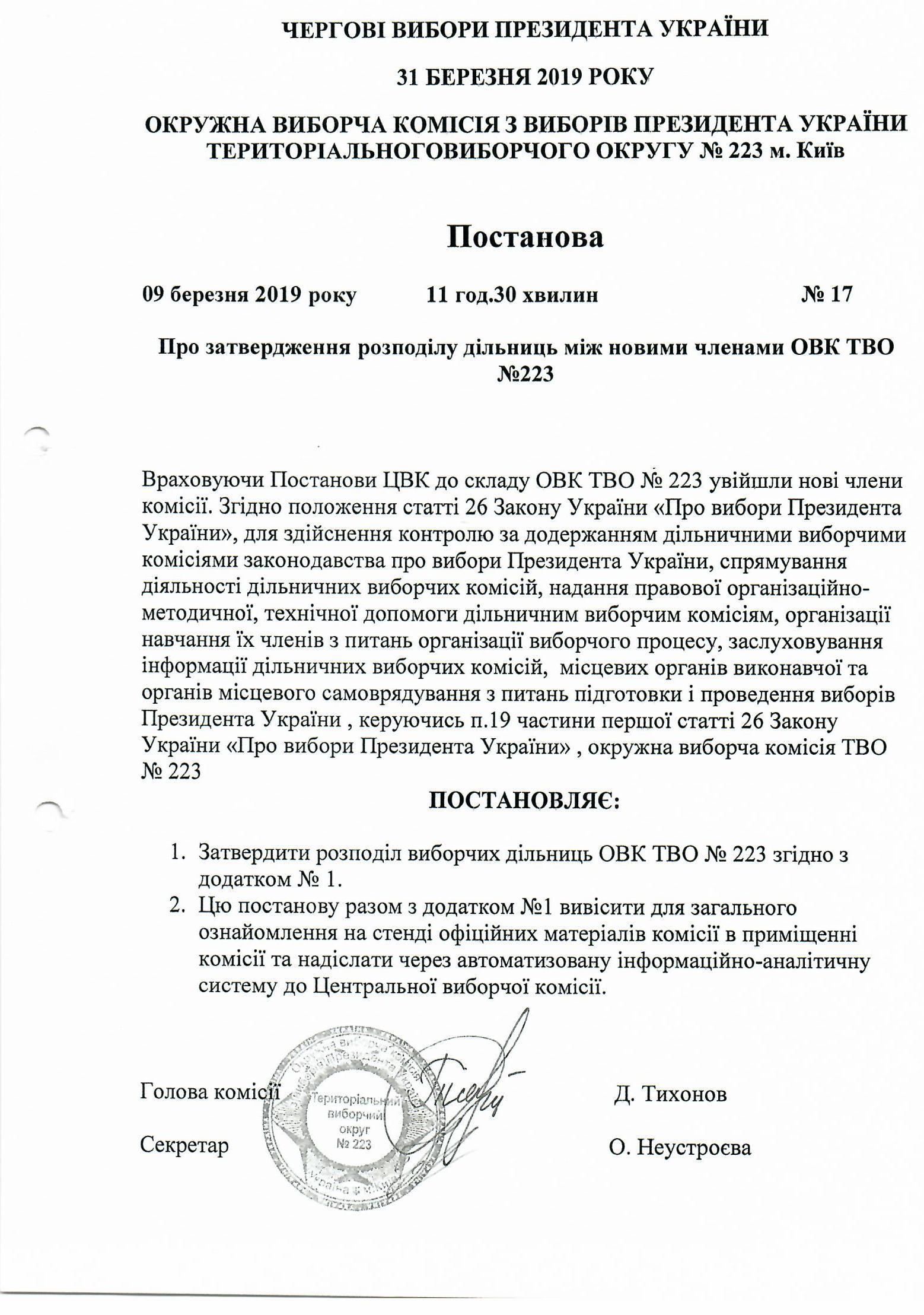 Про розподіл виборчих дільниць між членами ОВК ТВО №223. |
