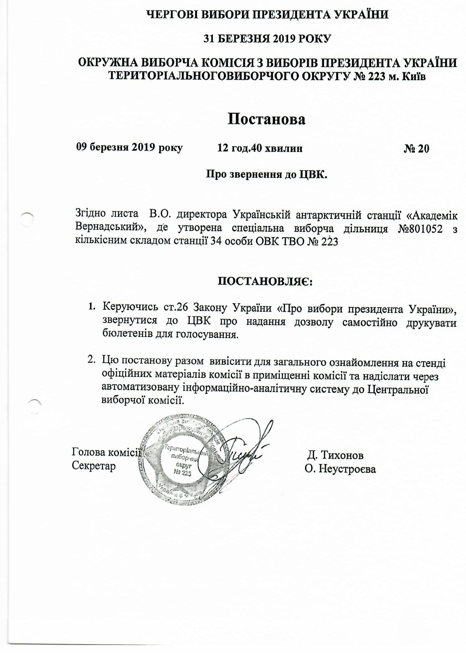 Про звернення до Центральної виборчої комісії про дострокове припинення повноважень деяких членів Окружної виборчої комісії з виборів Президента України територіального виборчого округу №223 (мю Київ) |