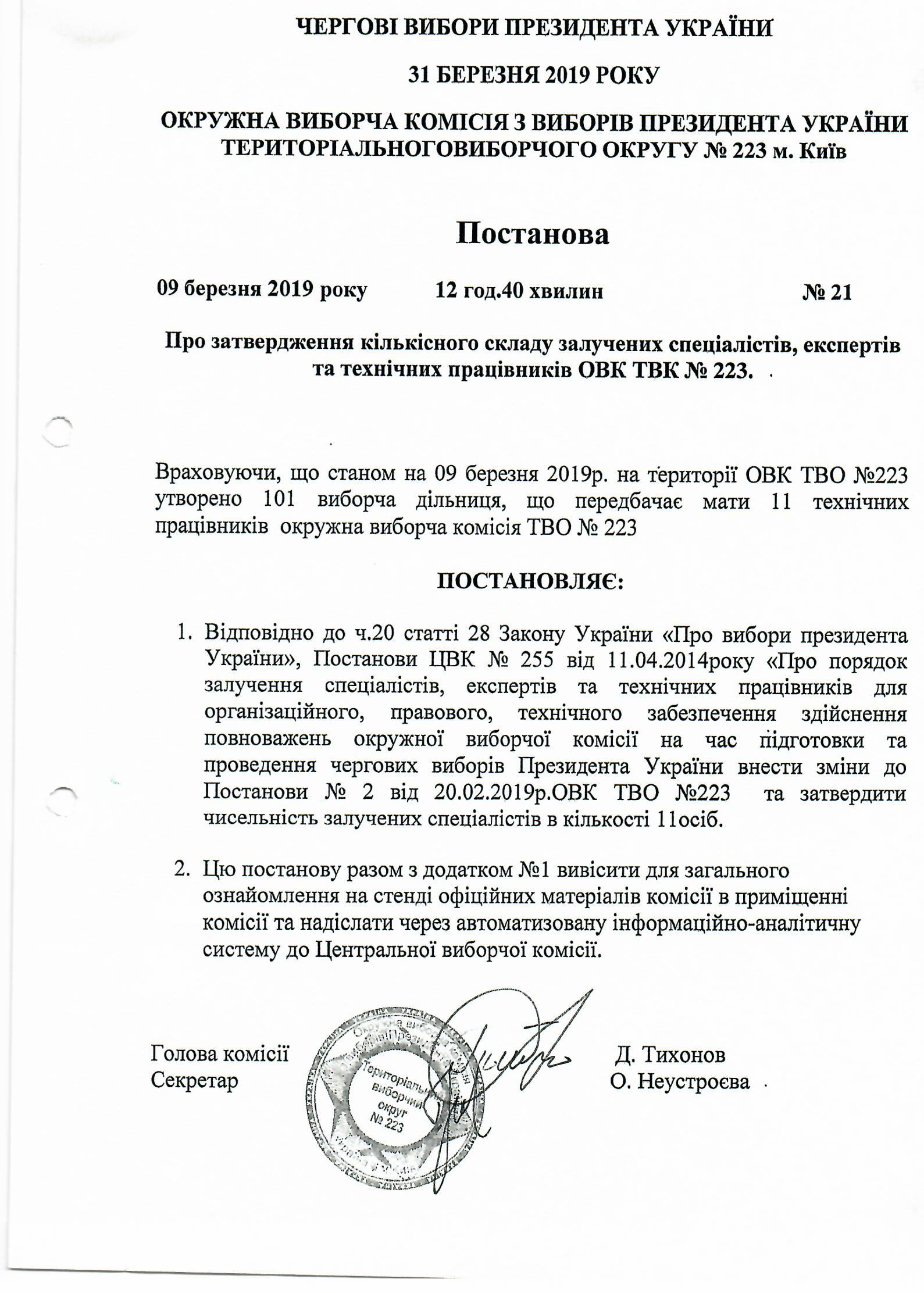 Про затвердження кількісного складу залучених спеціалістів, еквспертів та технічних працівників ОВК ТВК №223. |