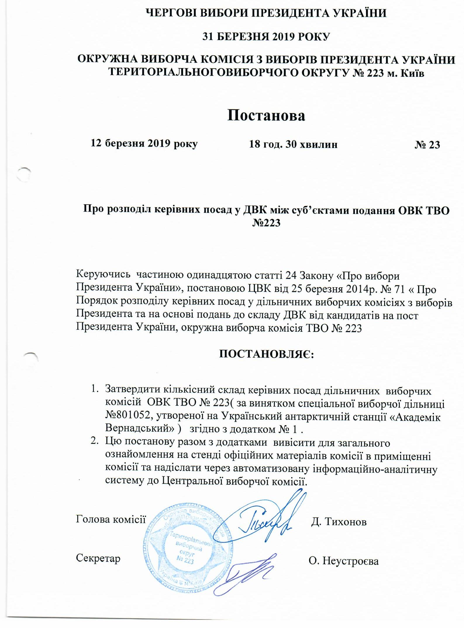 Про розподіл керівних посад у ДВК між суб’єктами подання ОВК ТВО №223. |