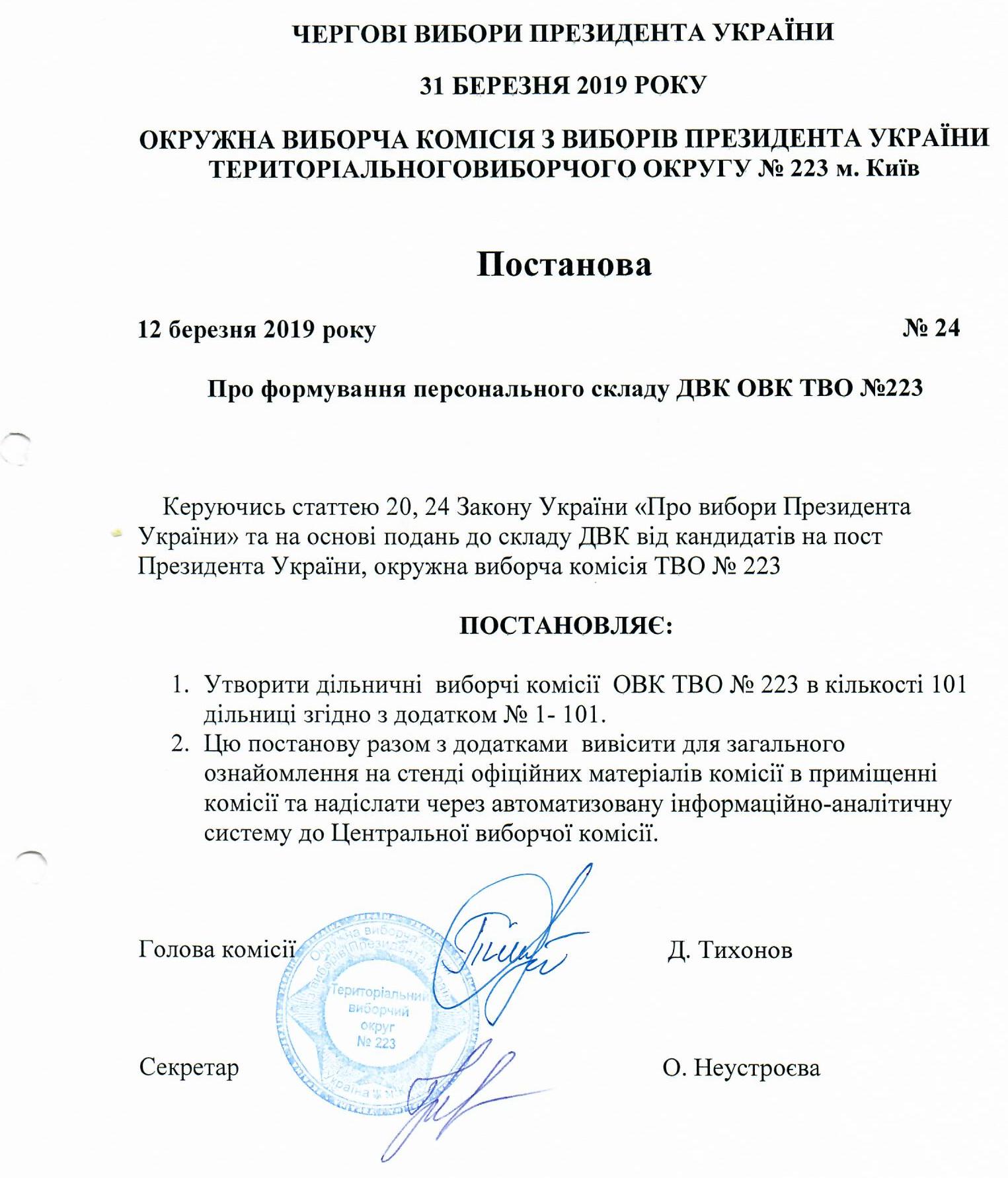 Про формування персонального складу ДВК ОВК ТВО №223 |