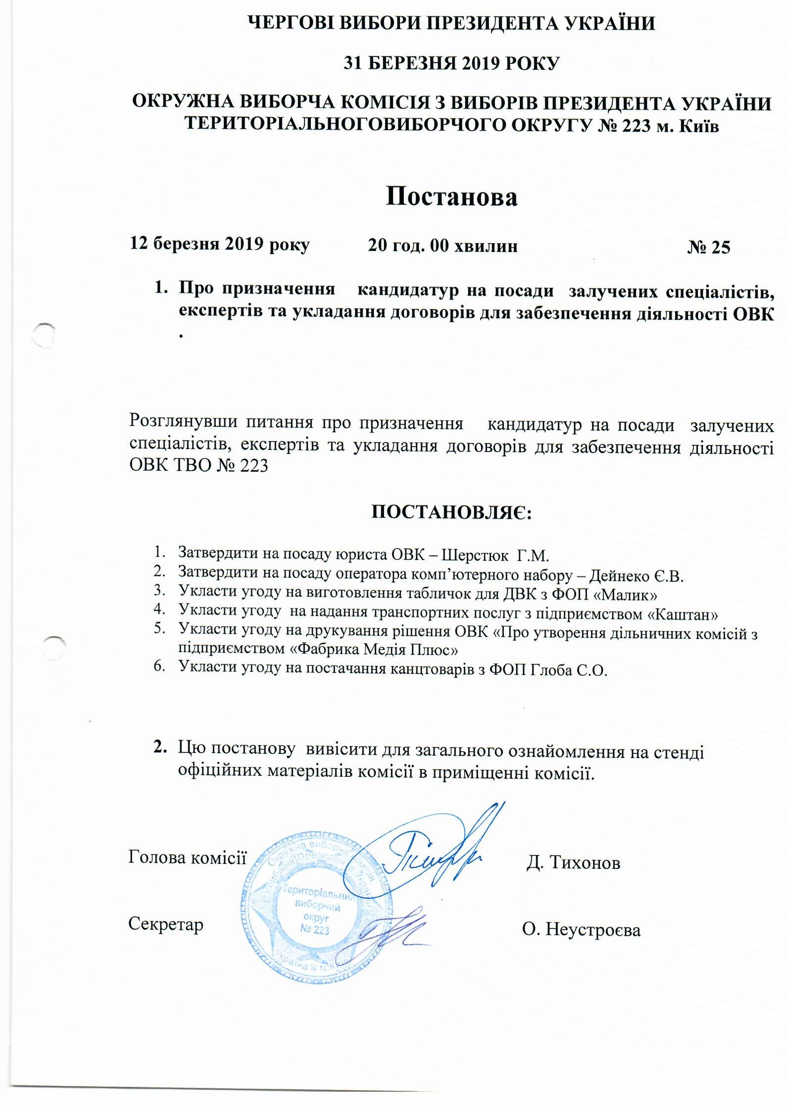 Про надання права першого підпису в бухгалтерських документах голова комісії ОВК ТВО №223 |