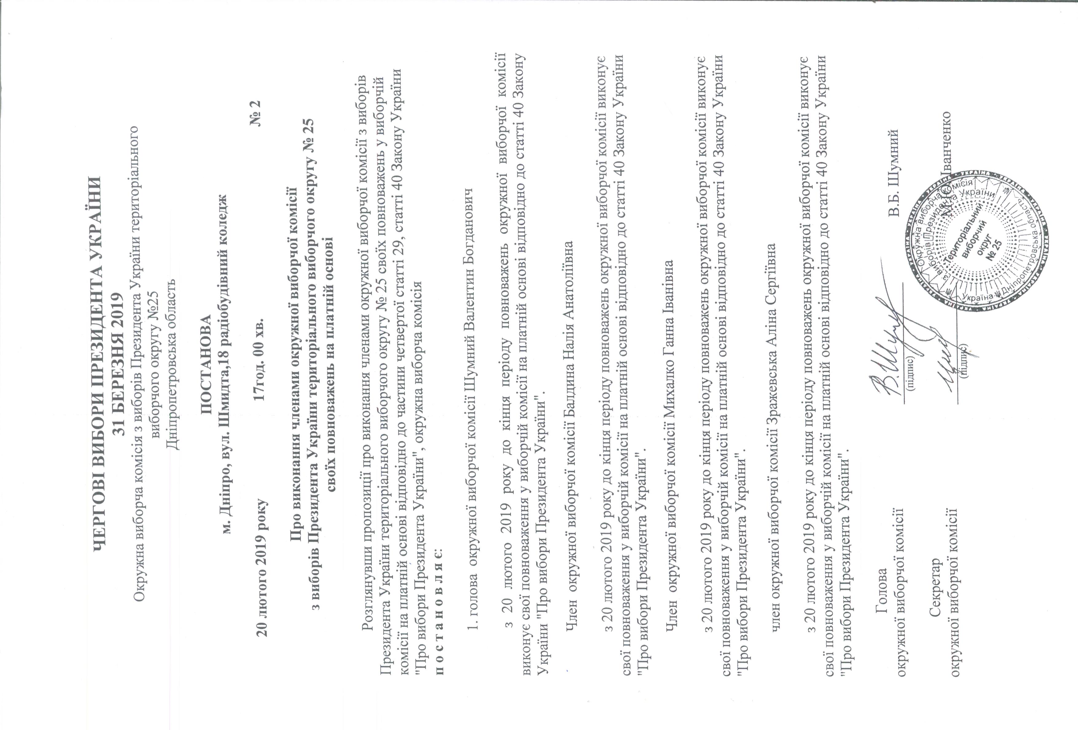 Про внесення змін до постанови №2 від 20 лютого 2019 року окружної виборчої комісії з виборів Президента України територіального виборчого округу №25, щодо виконання обов'язків членів комісії на платній основі |