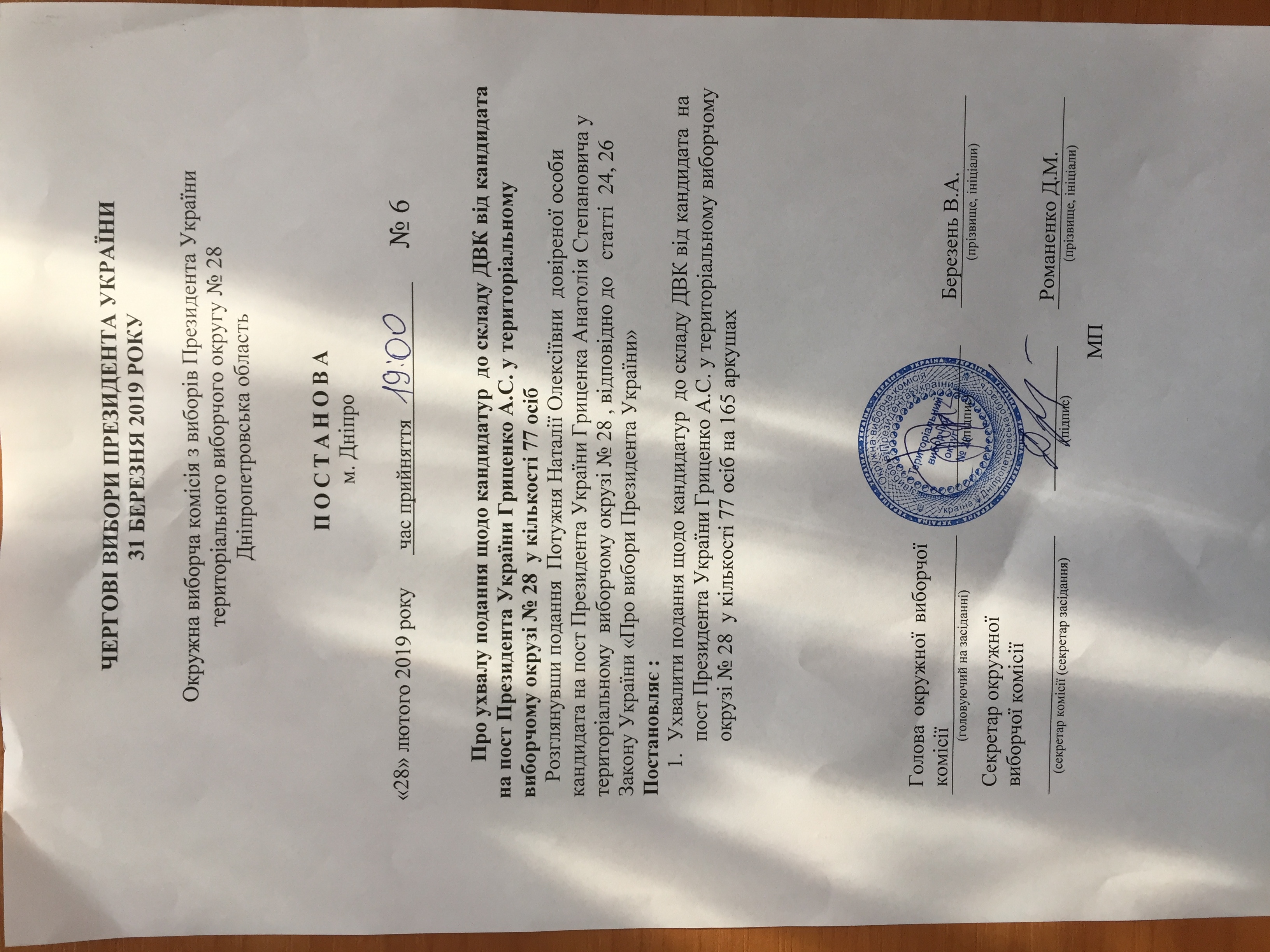 Про ухвалу подання щодо кандидатур до складу ДВК від кандидата на пост Президента України Гриценка А.С. у територіальному виборчому окрузі № 28 у кількості 77 осіб |