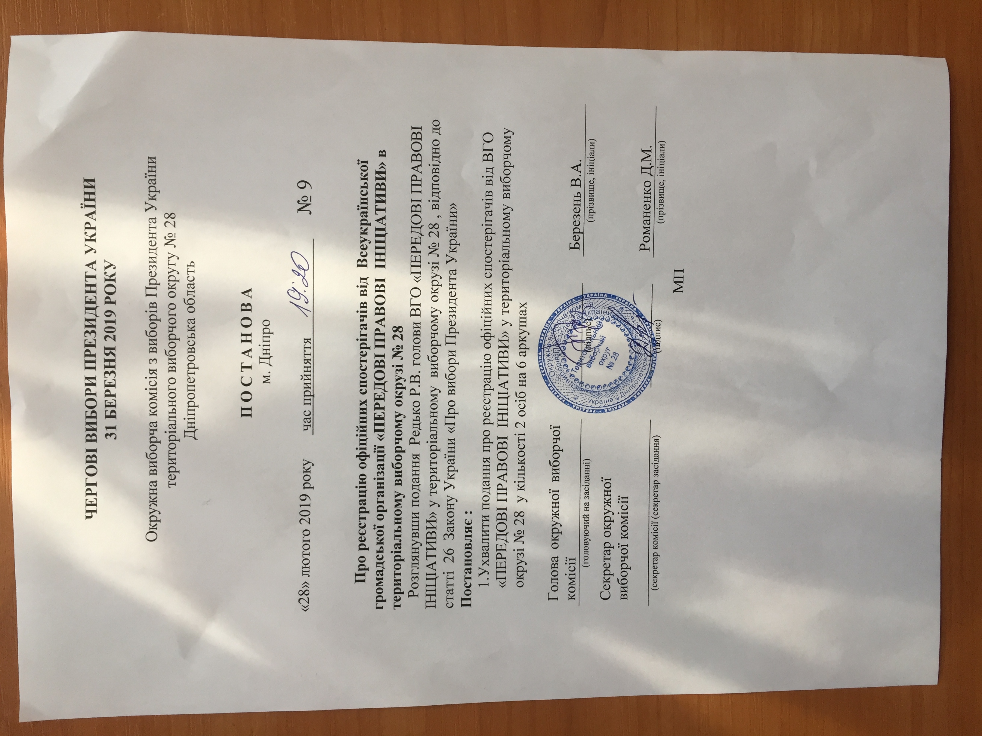 Про реєстрацію офіційних спостерігачів від Всеукраїнської громадської організації " Передові правові ініціативи" в територіальному виборчому окрузі № 28 |