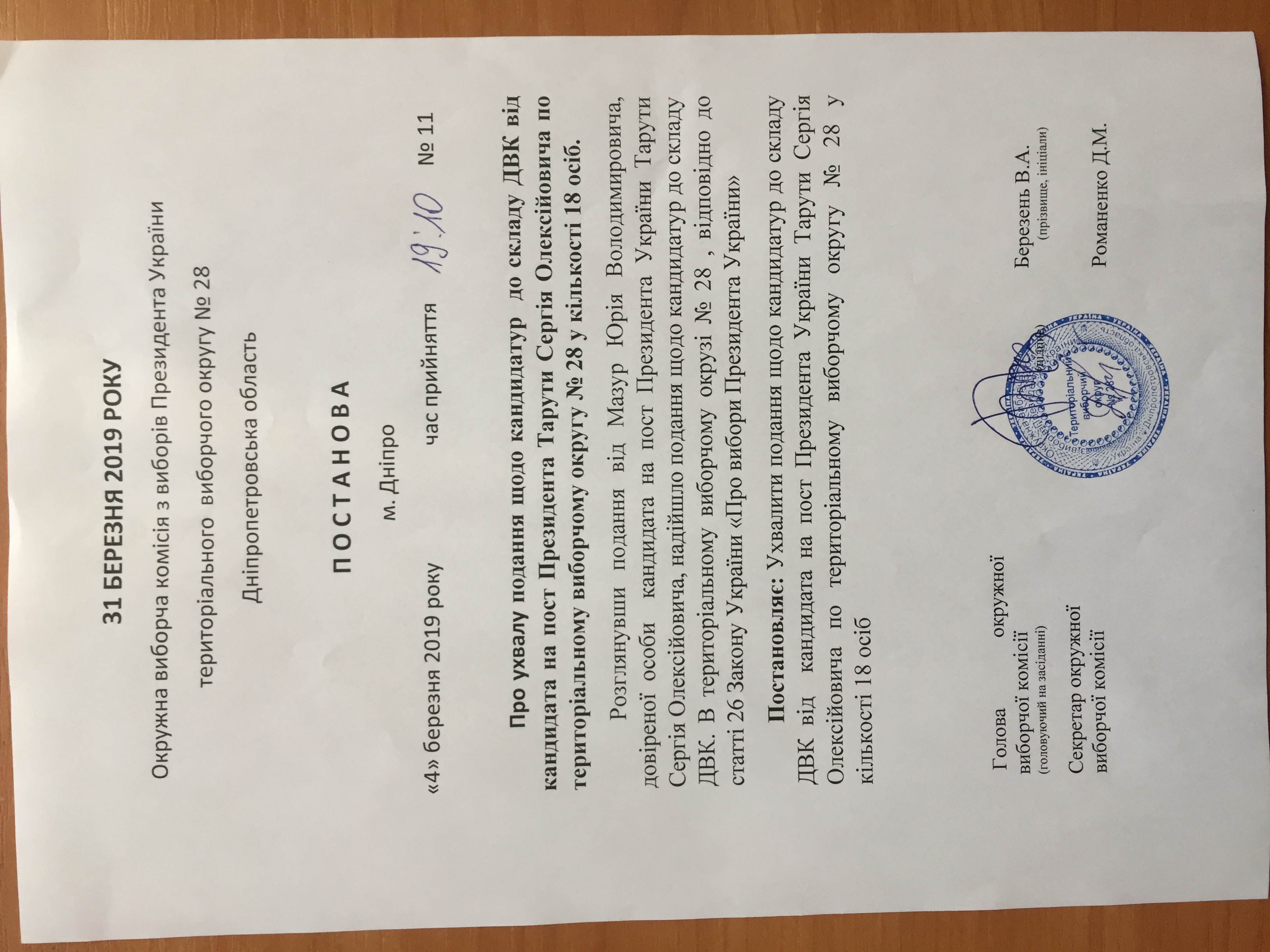 Про ухвалу подання щодо кандидатур до складу ДВК від кандидата на пост Президента Тарути Сергія Олексійовича по територіальному виборчому округу № 28 у кількості 18 осіб |