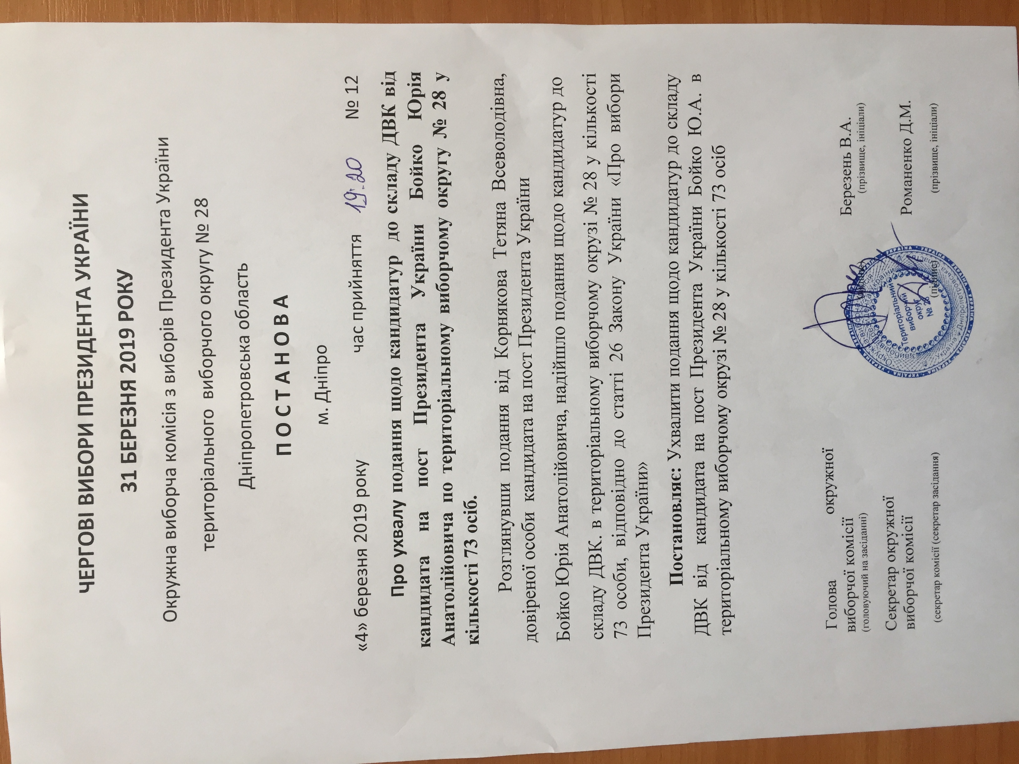 Про ухвалу подання щодо кандидатур до складу ДВК від кандидата на пост Президента України Бойко Юрія Анатолійовича по територіальному виборчому округу № 28 у кількості 73 осіб |