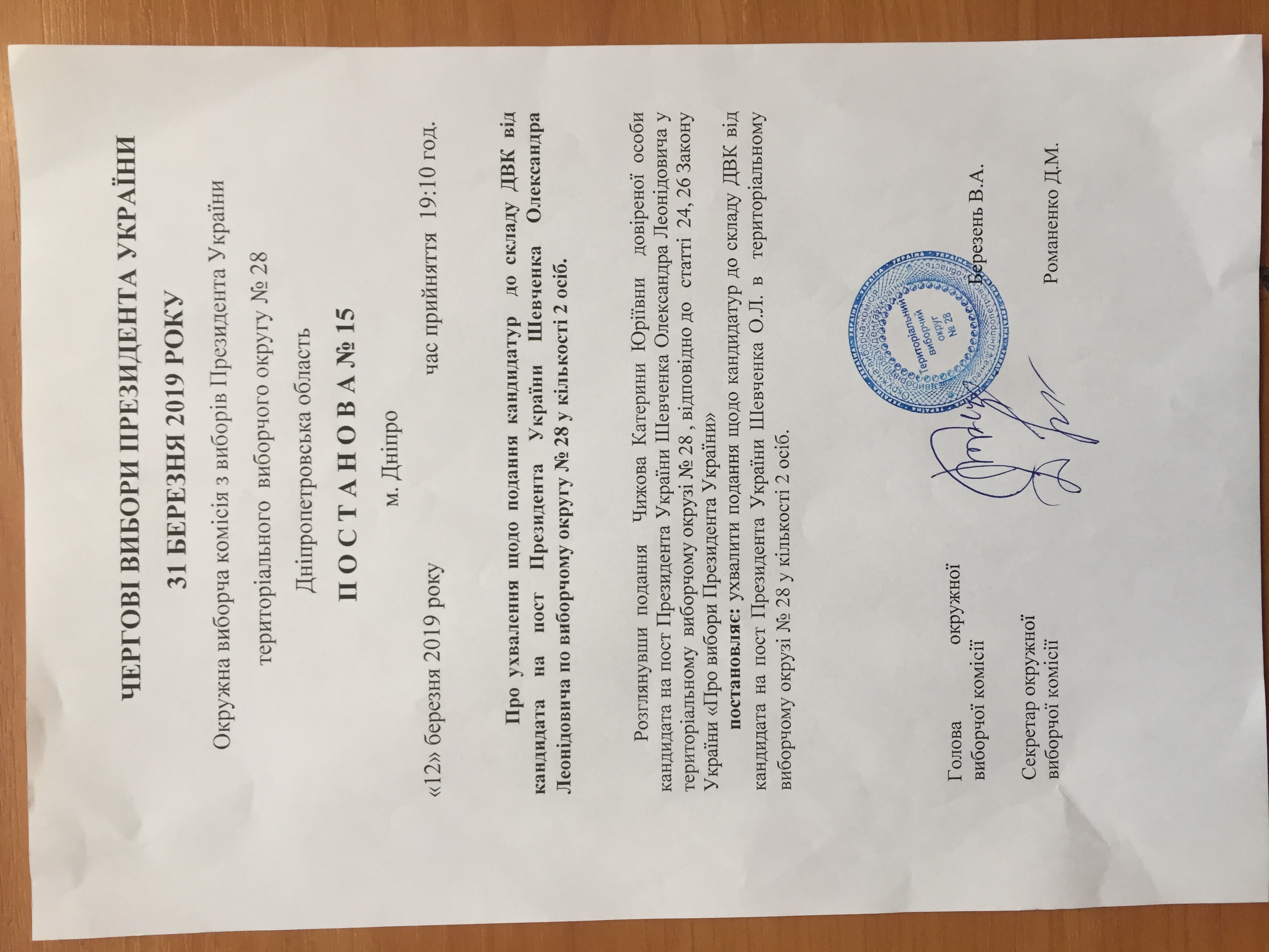 Про ухвалення щодо подання кандидатур до складу ДВК від кандидата на пост Президента України Шевченка Олександра Леонідовича по виборчому округу № 28 у кількості 2 осіб |
