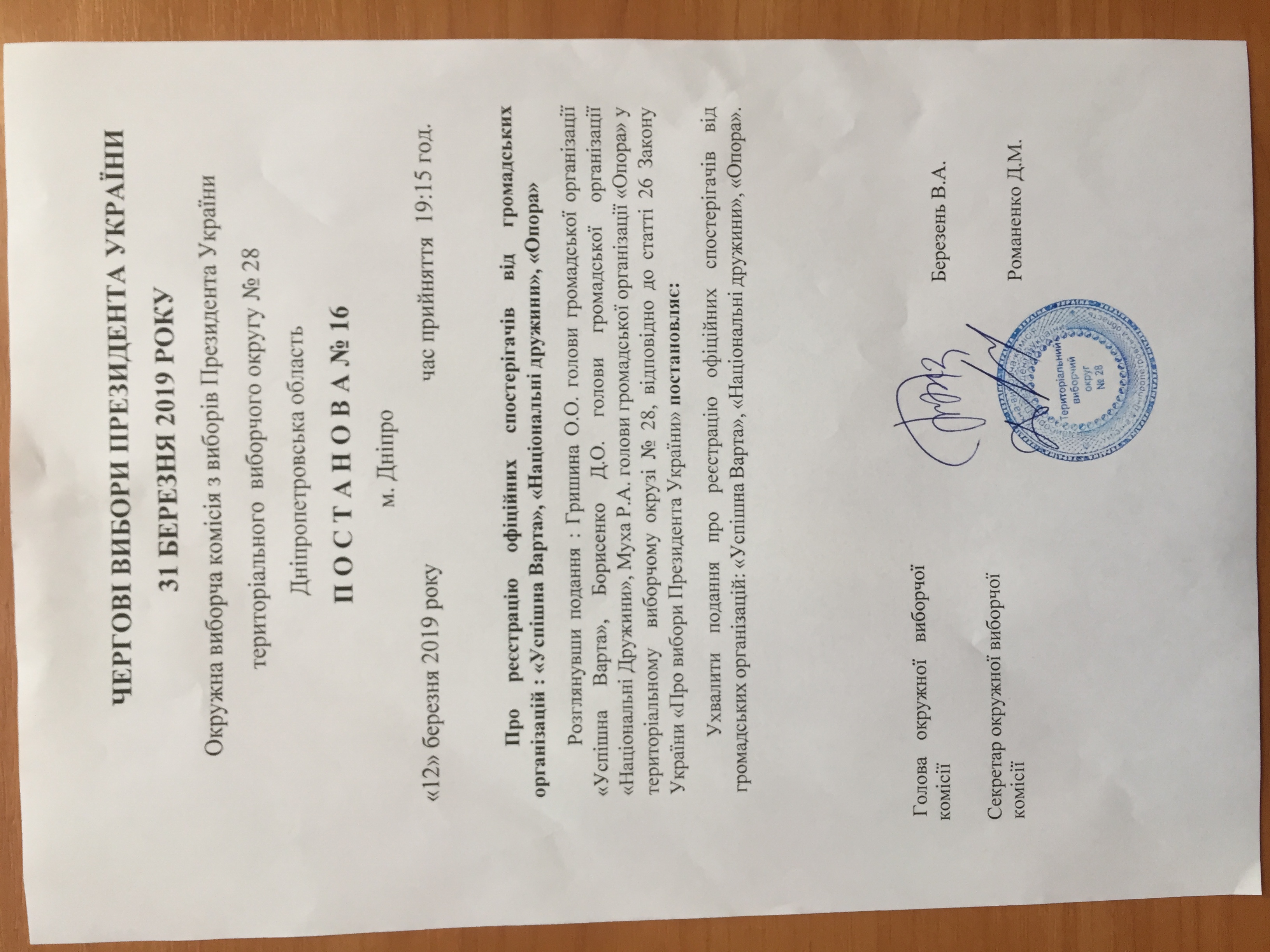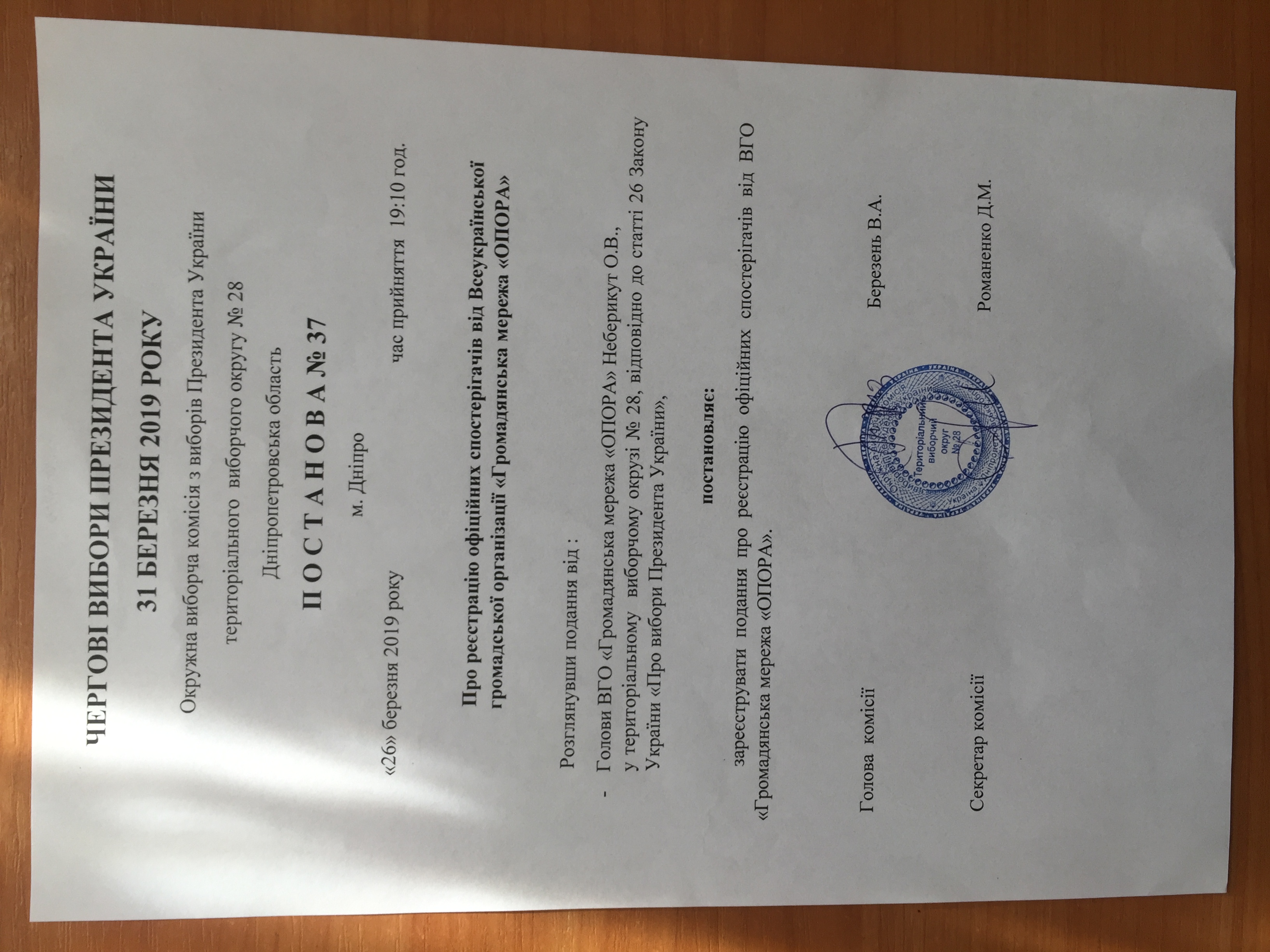Про реєстрацію офіційних спостерігачів від Всеукраїнської громадської організації «Громадянська мережа «ОПОРА» |