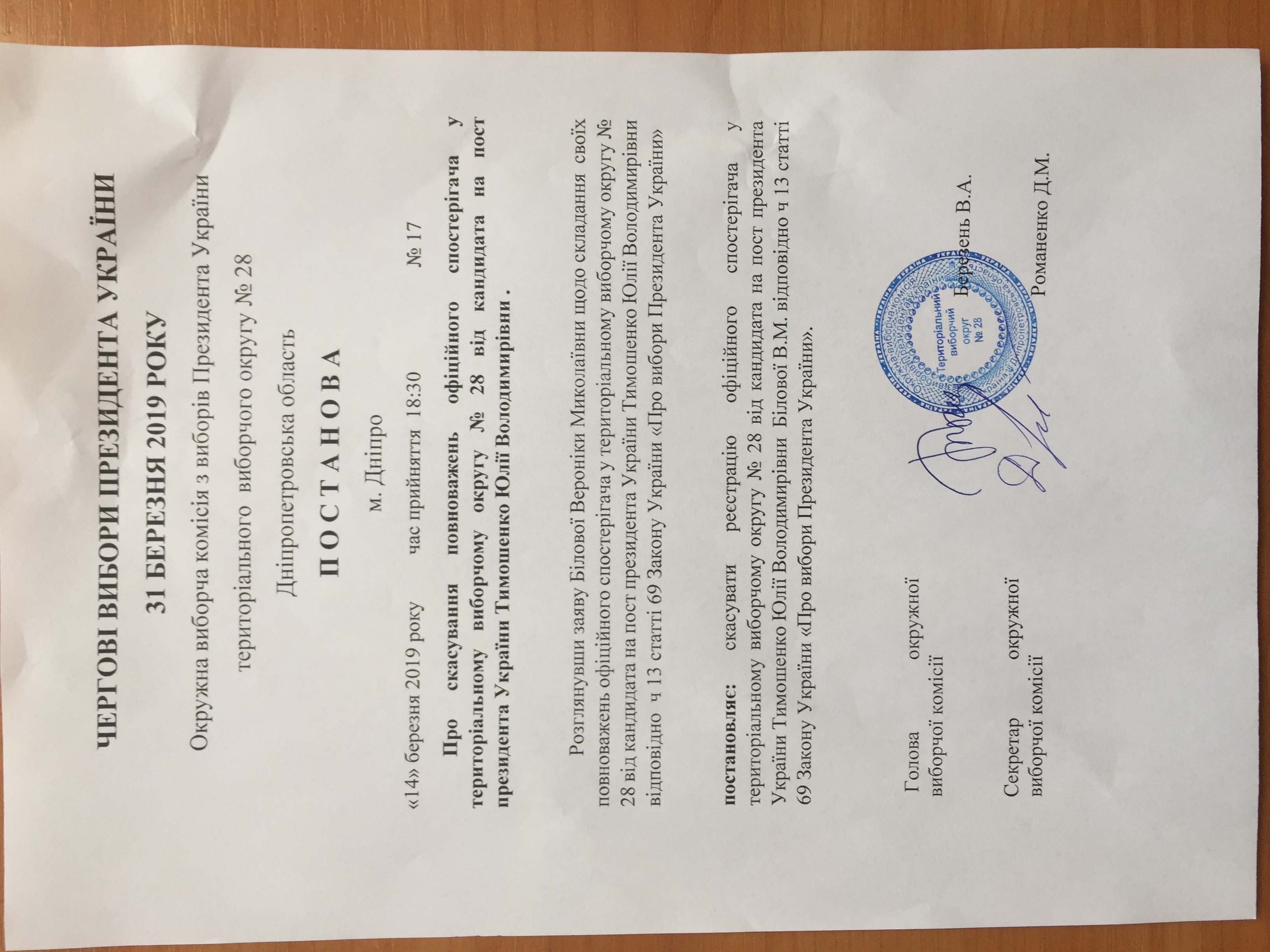 Про скасування повноважень офіційного спостерігача у територіальному виборчому окрузі № 28 від кандидата на пост Президента України Тимошенко Юлії Володимирівни |