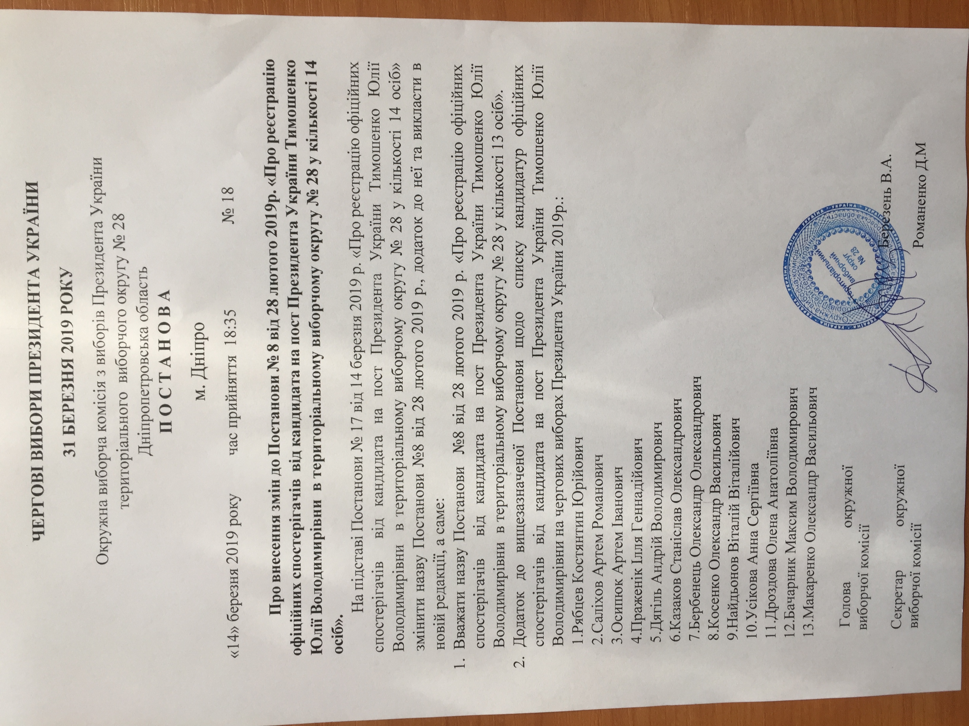 Про внесення змін до Постанови № 8 від 28 лютого 2019 року "Про реєстрацію офіційних спостерігачів від кандидата на пост Президента України Тимошенко Юлії Володимирівни в територіальному виборчому окрузі № 28 у кількості 14 осіб |