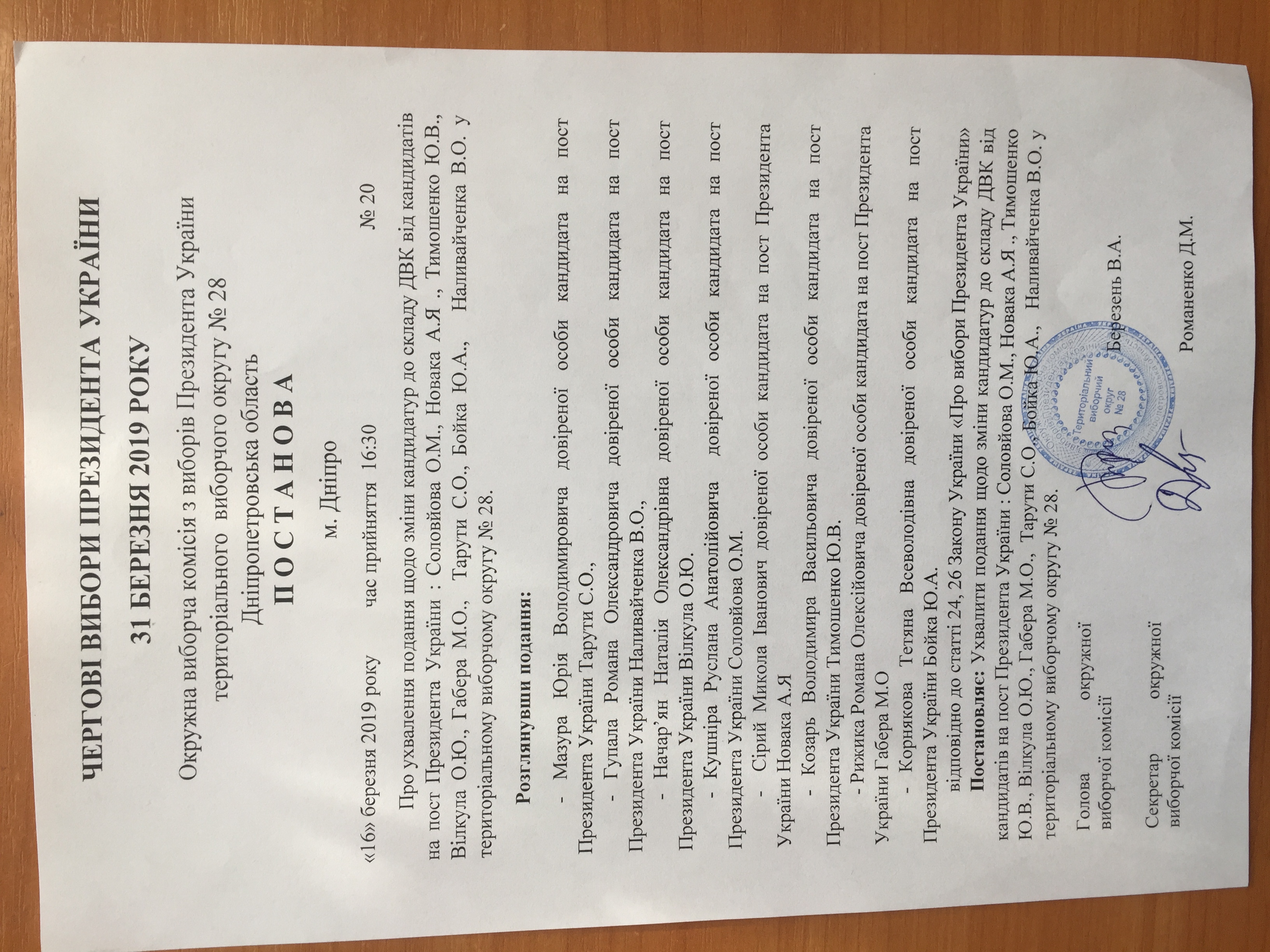 Про ухвалення подання щодо зміни кандидатур до складу ДВК від кандидатів на пост Президента України : Соловйова О.М., Новака А.Я ., Тимошенко Ю.В., Вілкула О.Ю., Габера М.О., Тарути С.О., Бойка Ю.А., Наливайченка В.О. у територіальному виборчому окрузі № 28 |