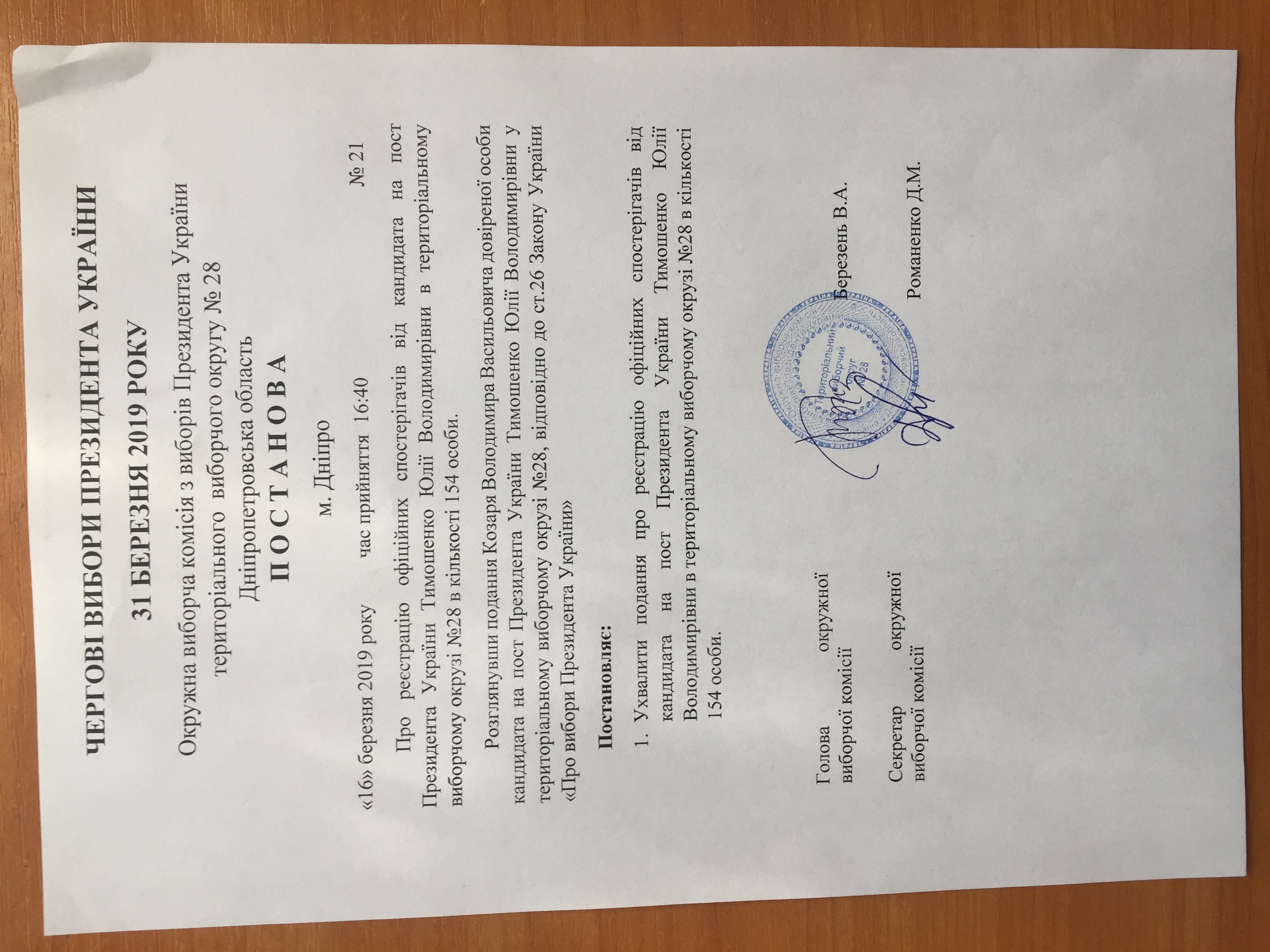 Про реєстрацію офіційних спостерігачів від кандидата на пост Президента України Тимошенко Юлії Володимирівни в територіальному виборчому окрузі № 28 в кількості 154 особи |