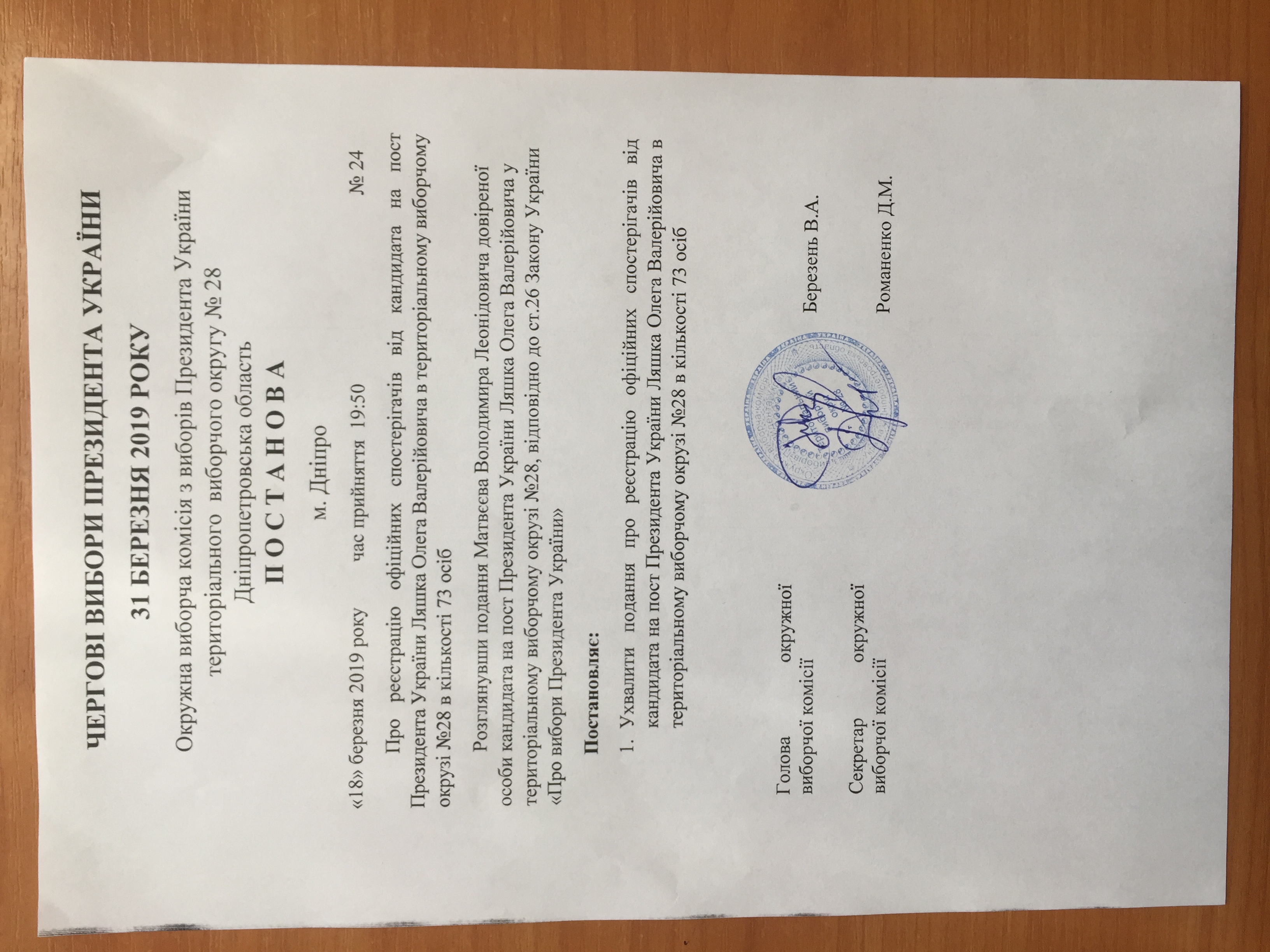 Про реєстрацію офіційних спостерігачів від кандидата на пост Президента України Ляшка Олега Валерійовича в територіальному виборчому окрузі № 28 в кількості 73 осіб |