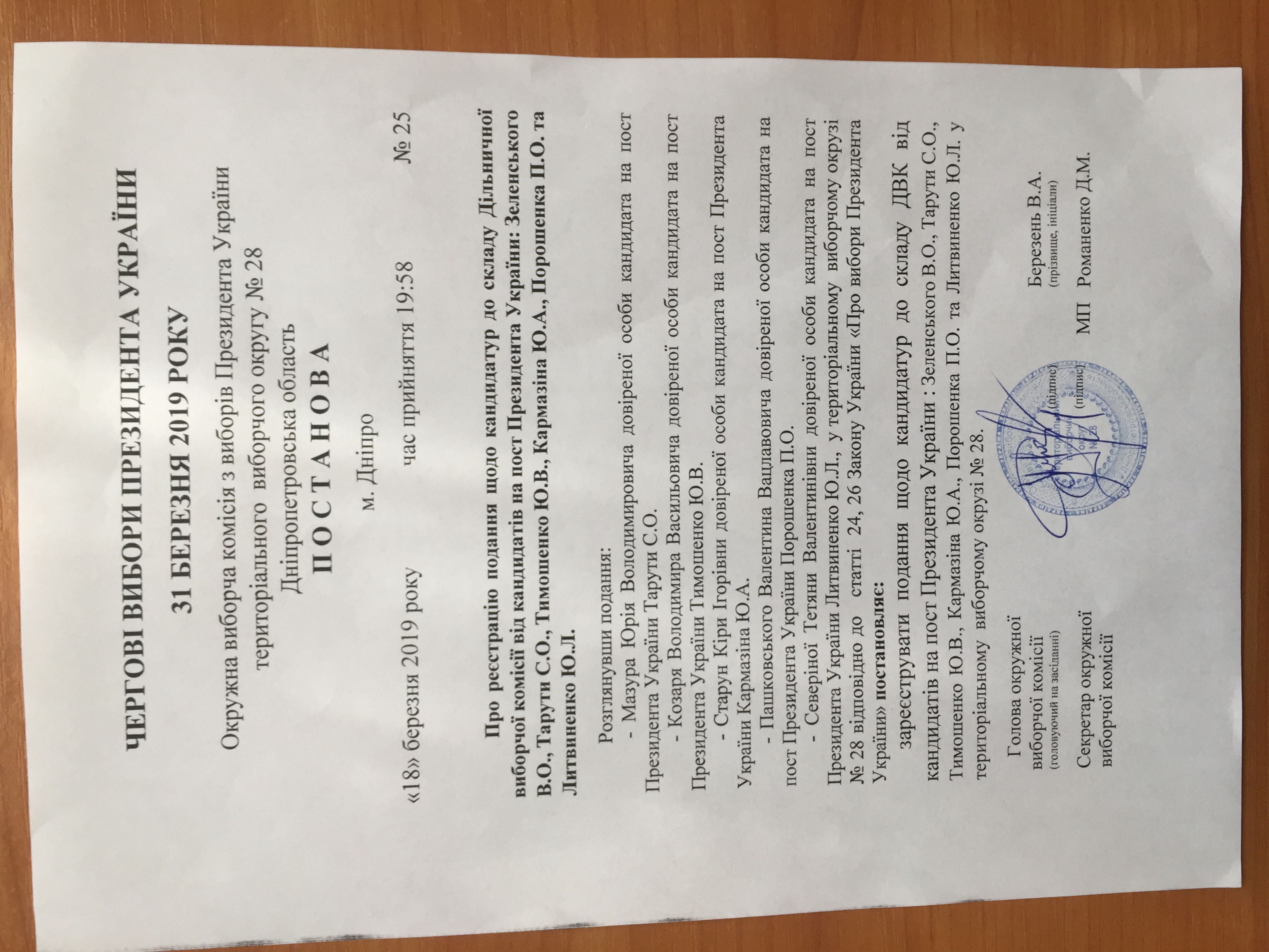 Про реєстрацію подання щодо кандидатур до складу дільничної виборчої комісії від кандидатів на пост Президента України: Зеленського В.О., Тарути С.О., Тимошенко Ю.В., Кармазіна Ю.А., Порошенка П.О. та Литвиненко Ю.Л. |