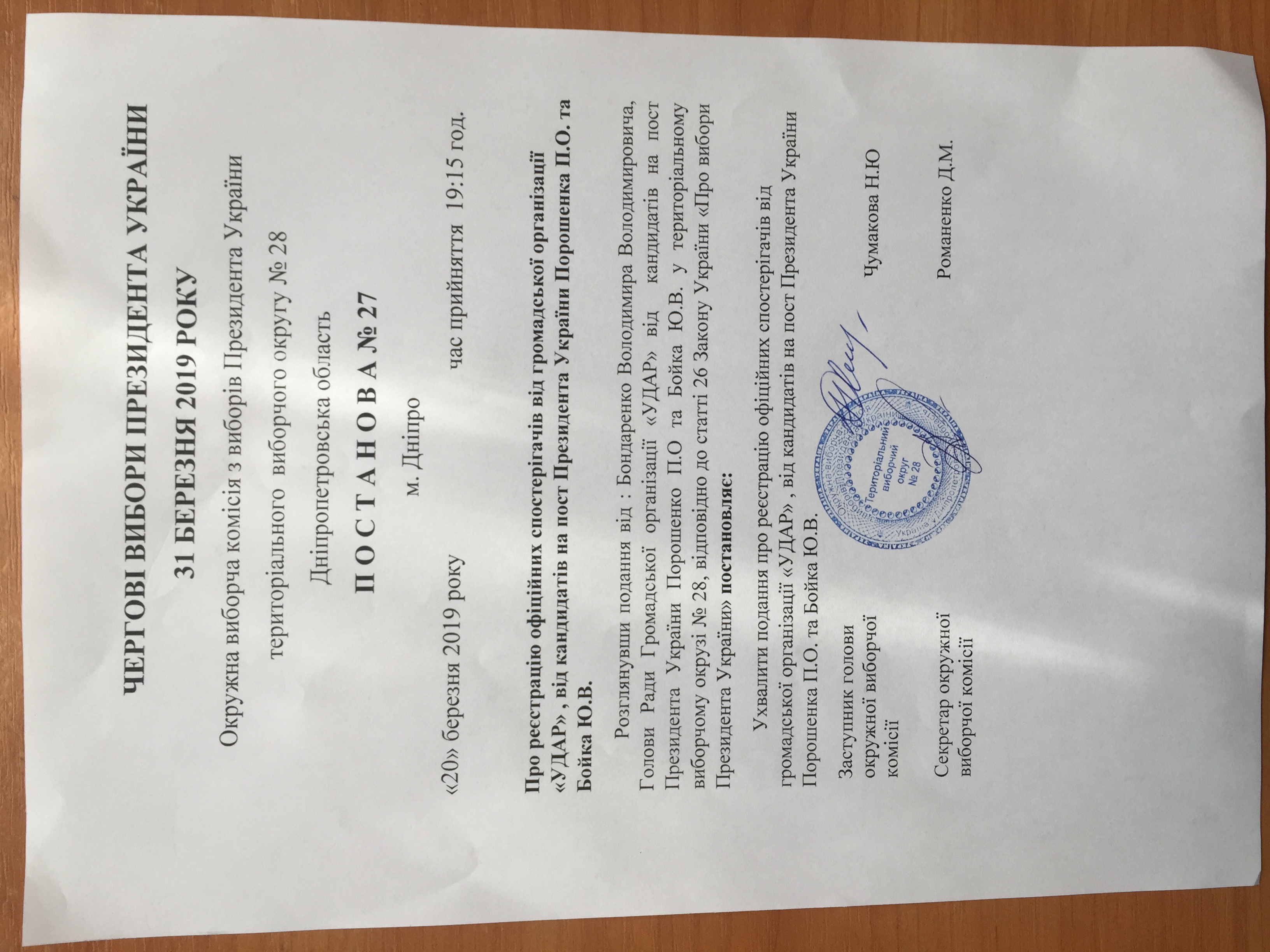 Про реєстрацію офіційних спостерігачів від громадської організації «УДАР» , від кандидатів на пост Президента України Порошенка П.О. та Бойка Ю.В. |