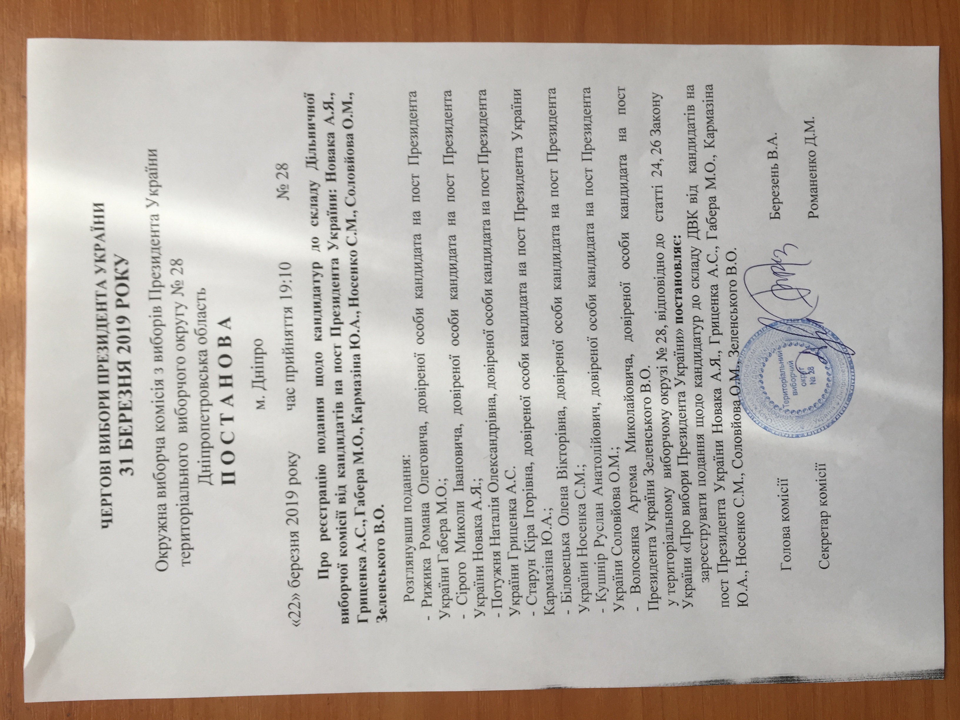 Про реєстрацію подання щодо кандидатур до складу дільничної виборчої комісії від кандидатів на пост Президента України: Новака А.Я., Гриценка А.С., Габера М.О., Кармазіна Ю.А., Носенка С.М., Соловйова О.М., Зеленського В.О. |