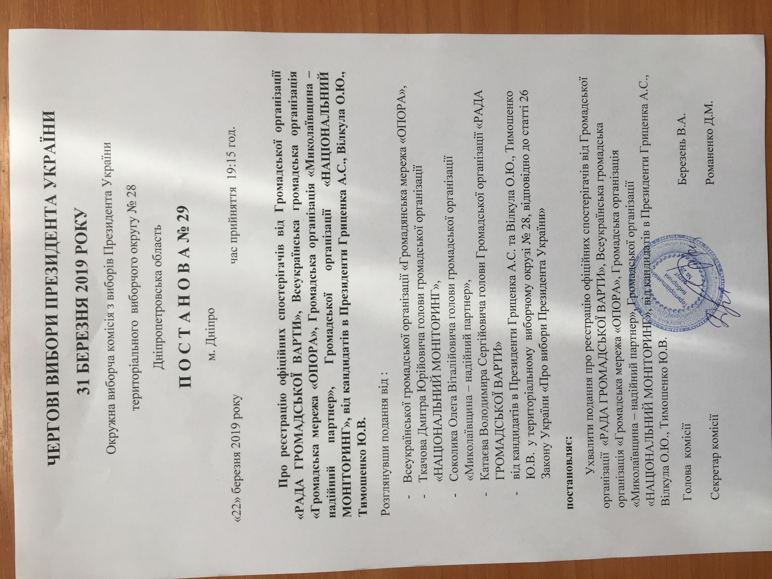 Про реєстрацію офіційних спостерігачів від громадської організації «РАДА ГРОМАДСЬКОЇ ВАРТИ», Всеукраїнська громадської організації «Громадянська мережа «ОПОРА», громадської організації «Миколаївщина – надійний партнер», громадської організації «НАЦІОНАЛЬНИЙ МОНІТОРИНГ», від кандидатів в Президенти: Гриценка А.С., Вілкула О.Ю., Тимошенко Ю.В. |