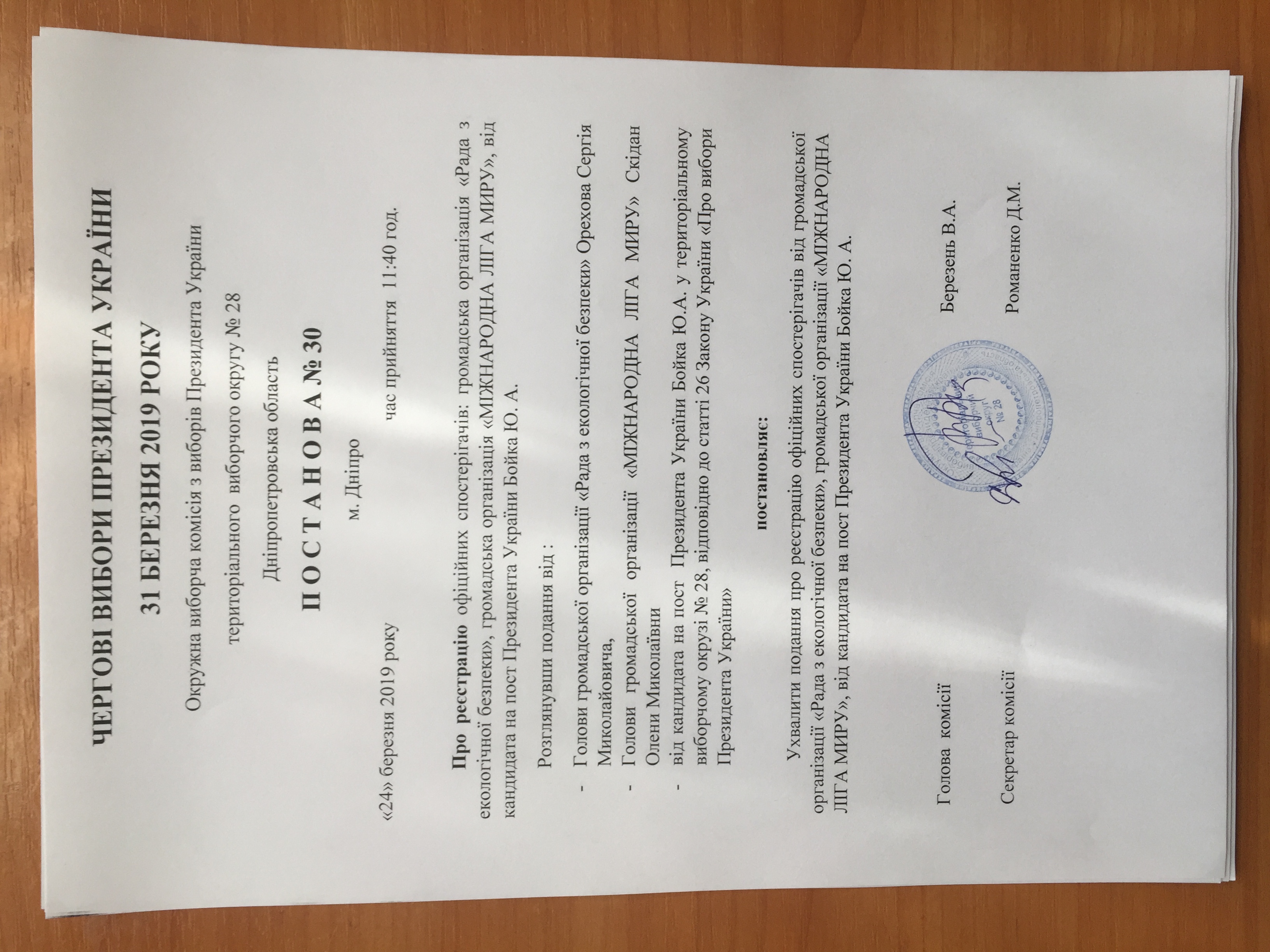 Про реєстрацію офіційних спостерігачів: громадська організація «Рада з екологічної безпеки», громадська організація «МІЖНАРОДНА ЛІГА МИРУ», від кандидата на пост Президента України Бойка Ю. А. |
