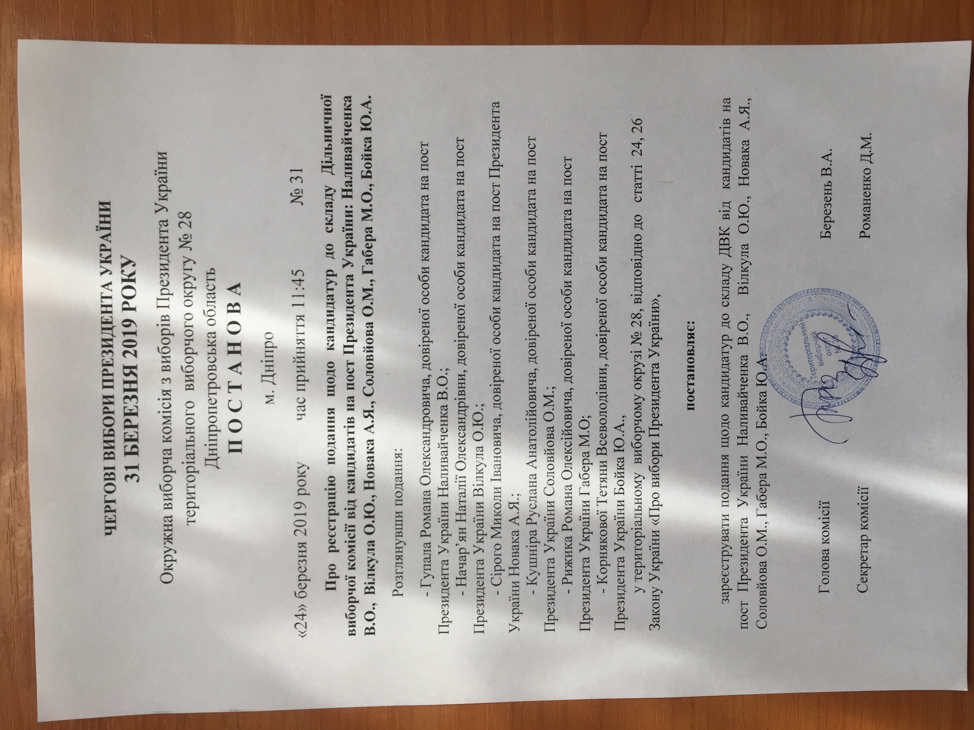 Про реєстрацію подання щодо кандидатур до складу дільничної виборчої комісії від кандидатів на пост Президента України: : Габера М.О., Наливайченка В.О., Новака А.Я., Соловйова О.М., Ляшка О.В., Ригованова Р.О., Тимошенко Ю.В., Бойка Ю.А., Зеленського В.О. |