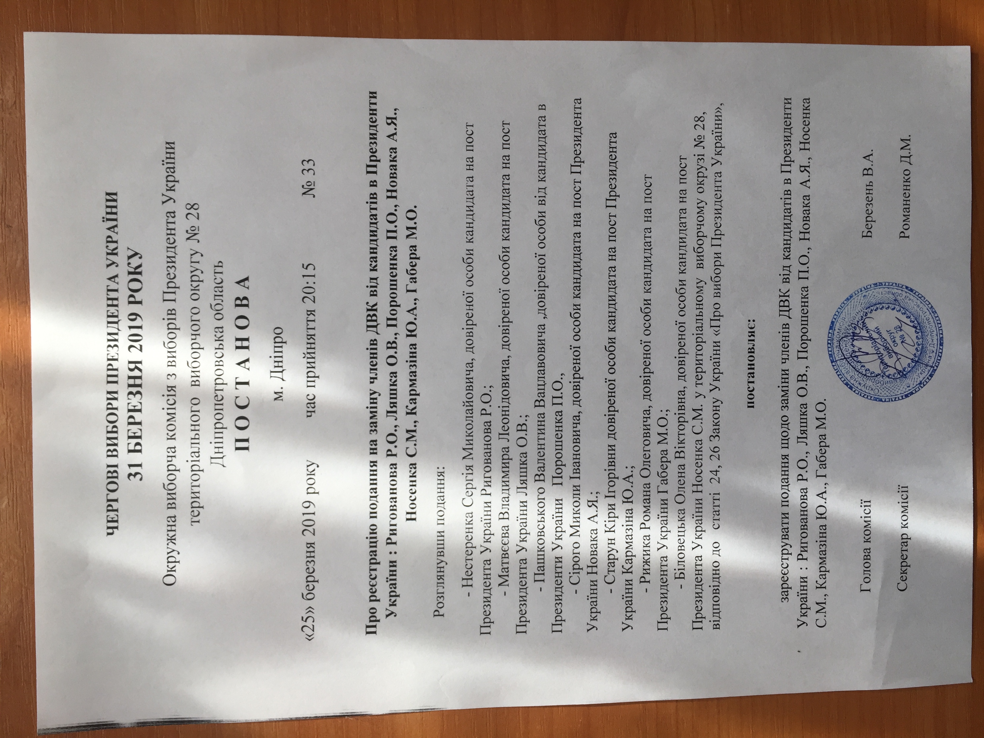 Про реєстрацію подання на заміну членів ДВК від кандидатів в Президенти України : Ригованова Р.О., Ляшка О.В., Порошенка П.О., Новака А.Я., Носенка С.М., Кармазіна Ю.А., Габера М.О. |