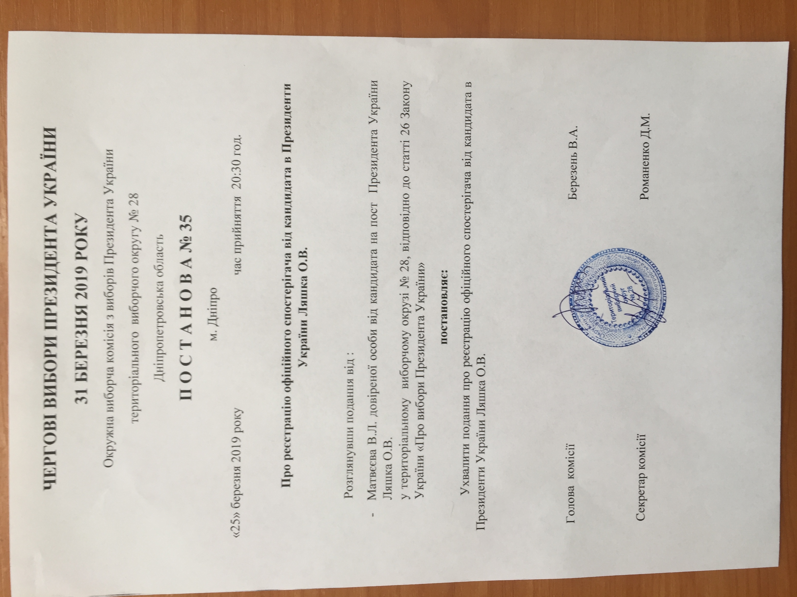 Про реєстрацію офіційного спостерігача від кандидата в Президенти України Ляшка О.В. |