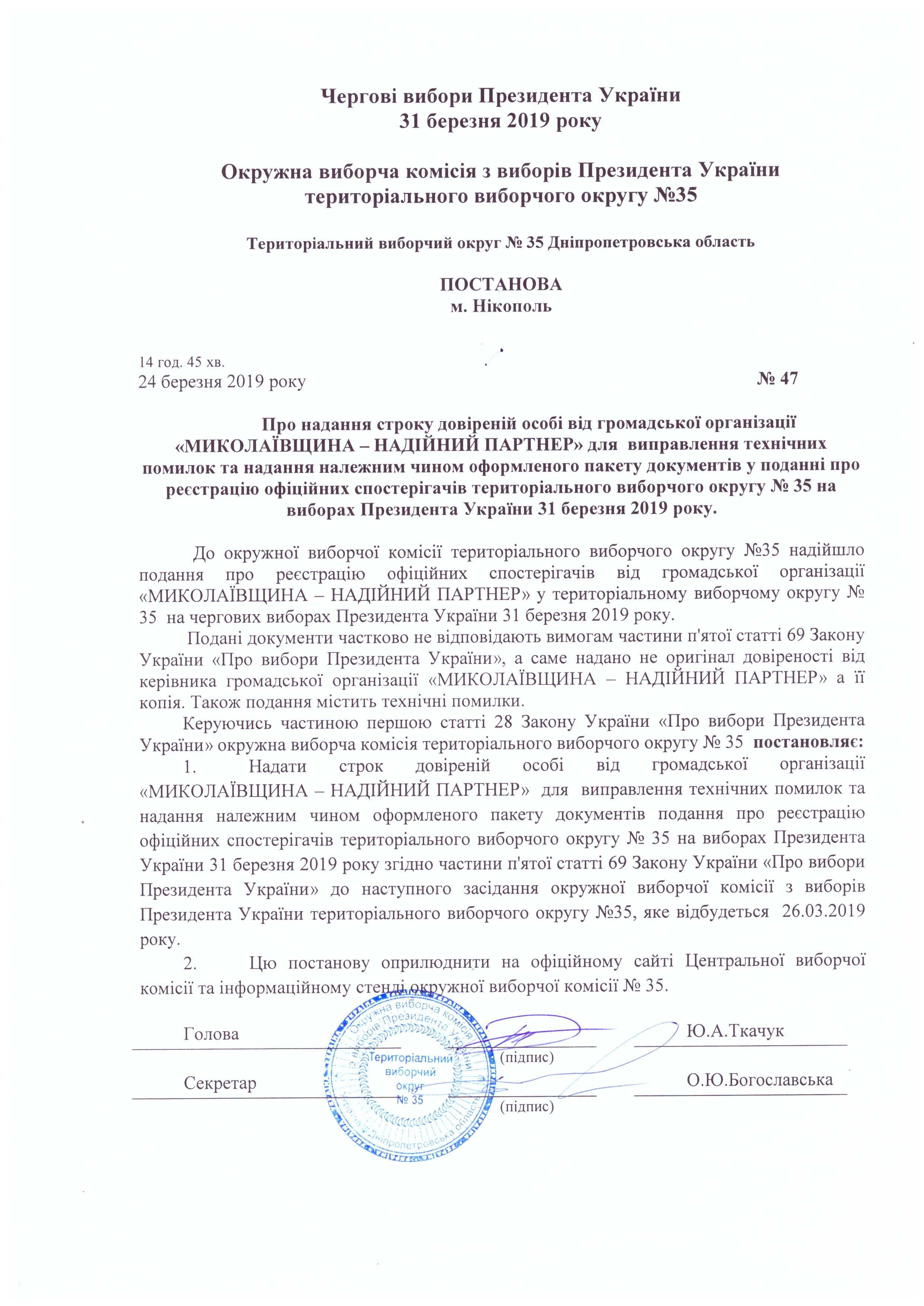 Про надання строку довіреній особі від громадської організації "Миколаївщина - Надійний Партнер" для виправлення технічних помилок та надання належним чином оформленого пакету документів у поданні про реєстрацію офіційних спостерігачів територіального виборчого округу № 35 на виборах Президента України 31 березня 2019 року |