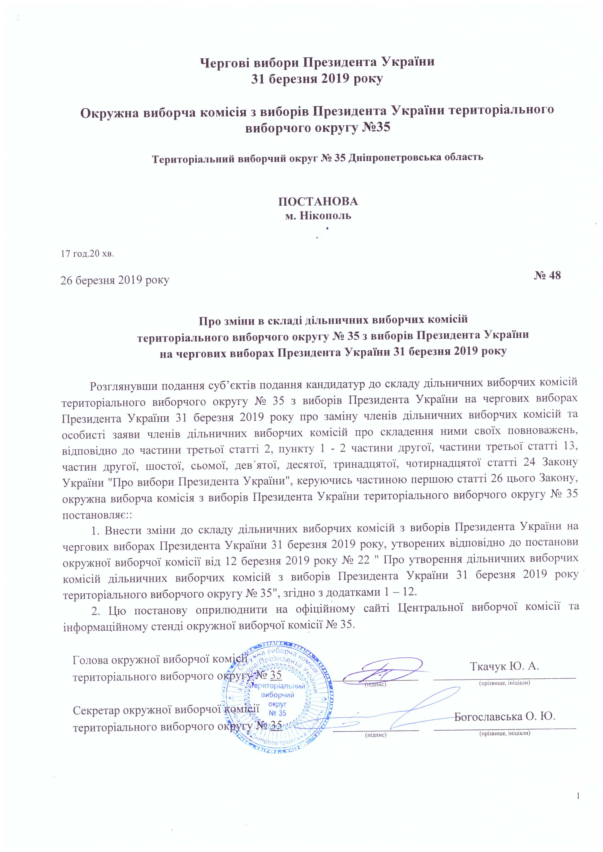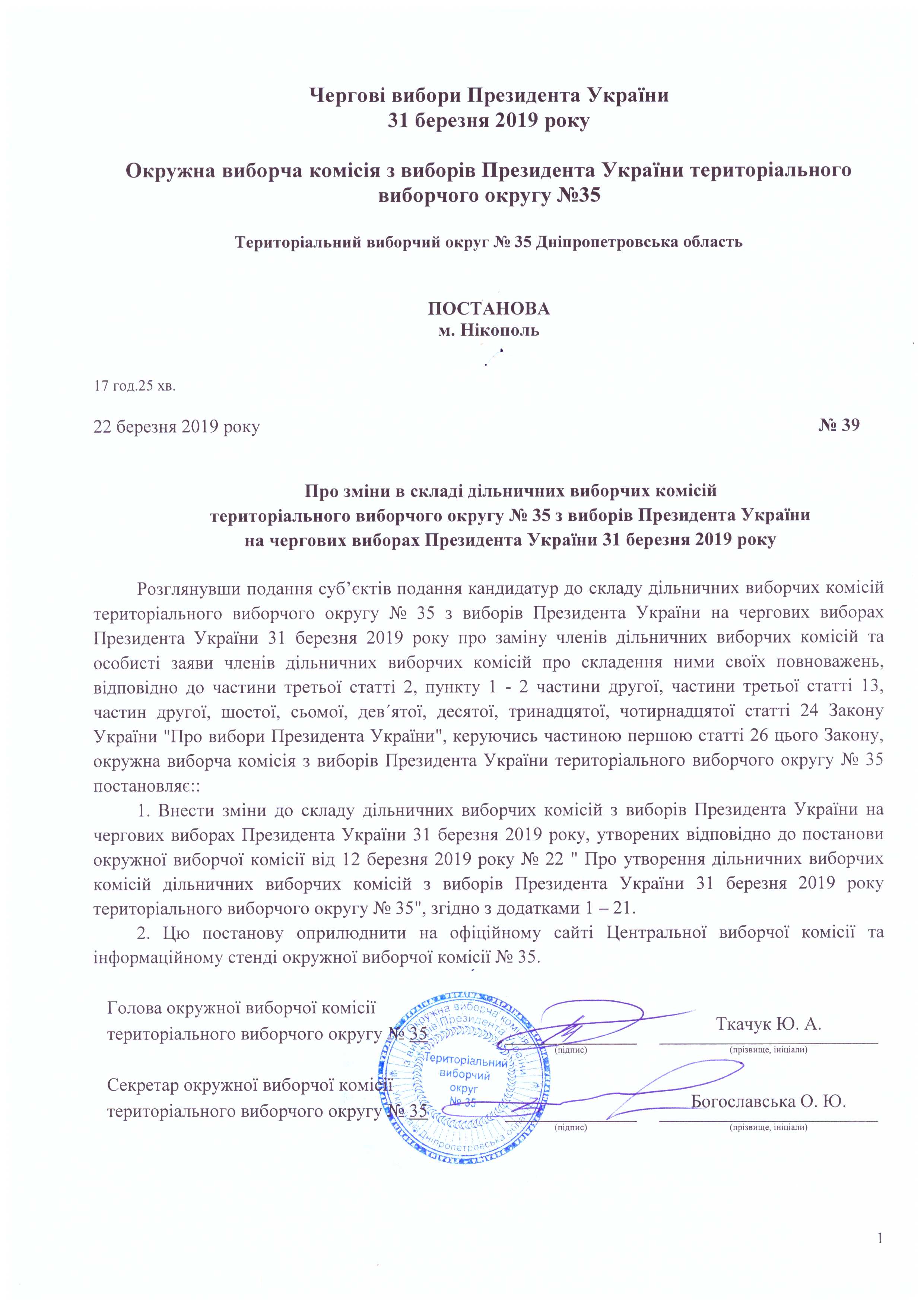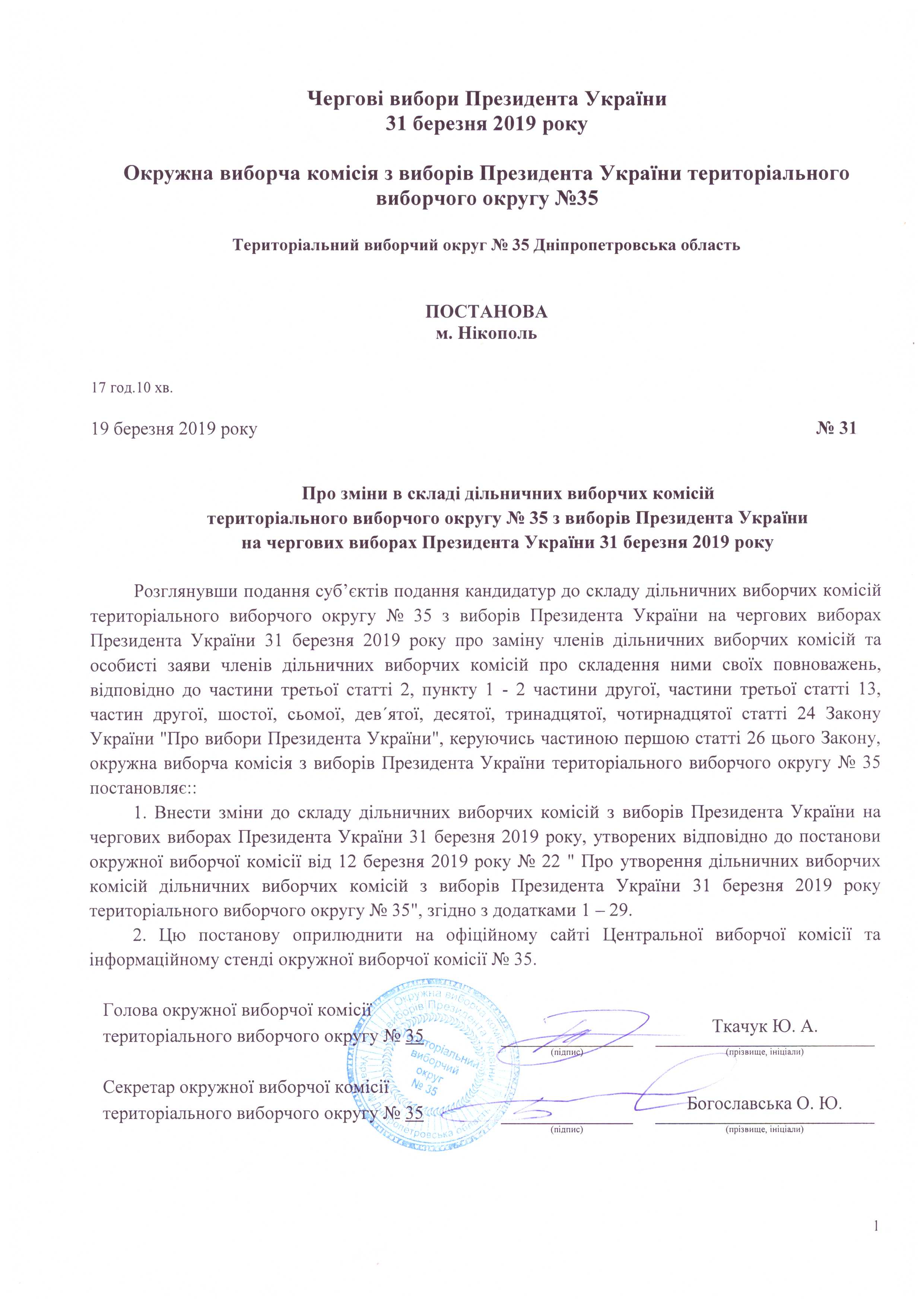Про зміни в складі дільничних виборчих комісій територіального виборчого округу №35 з виборів Президента України на чергових виборах Президента України 31 березня 2019 року |