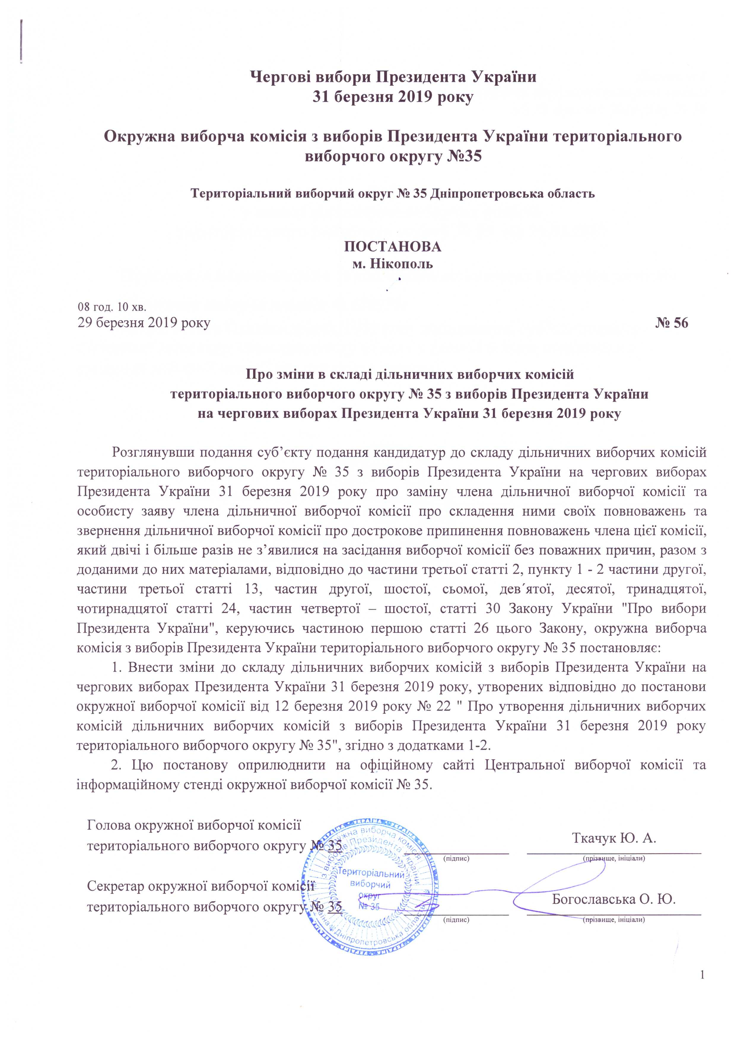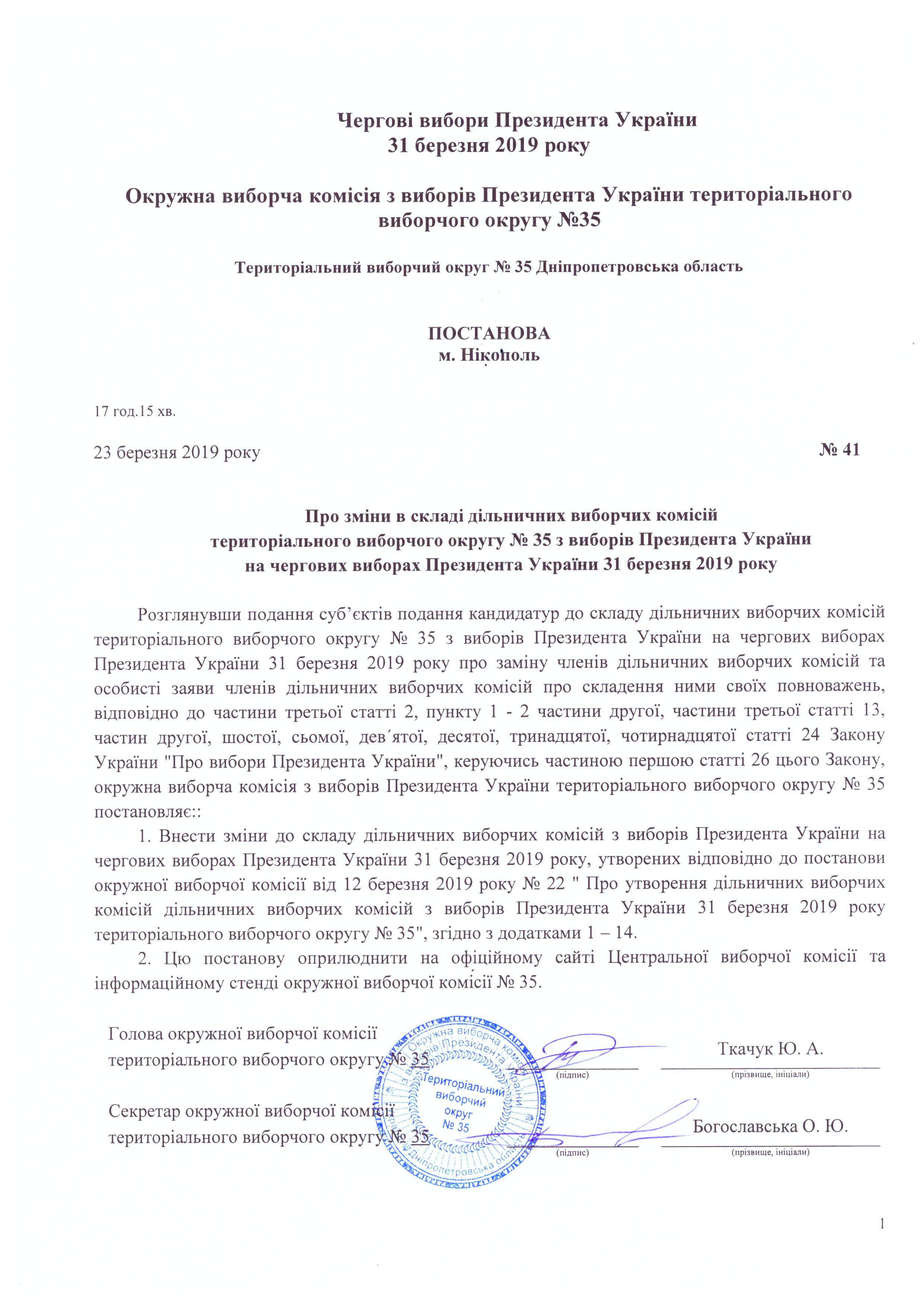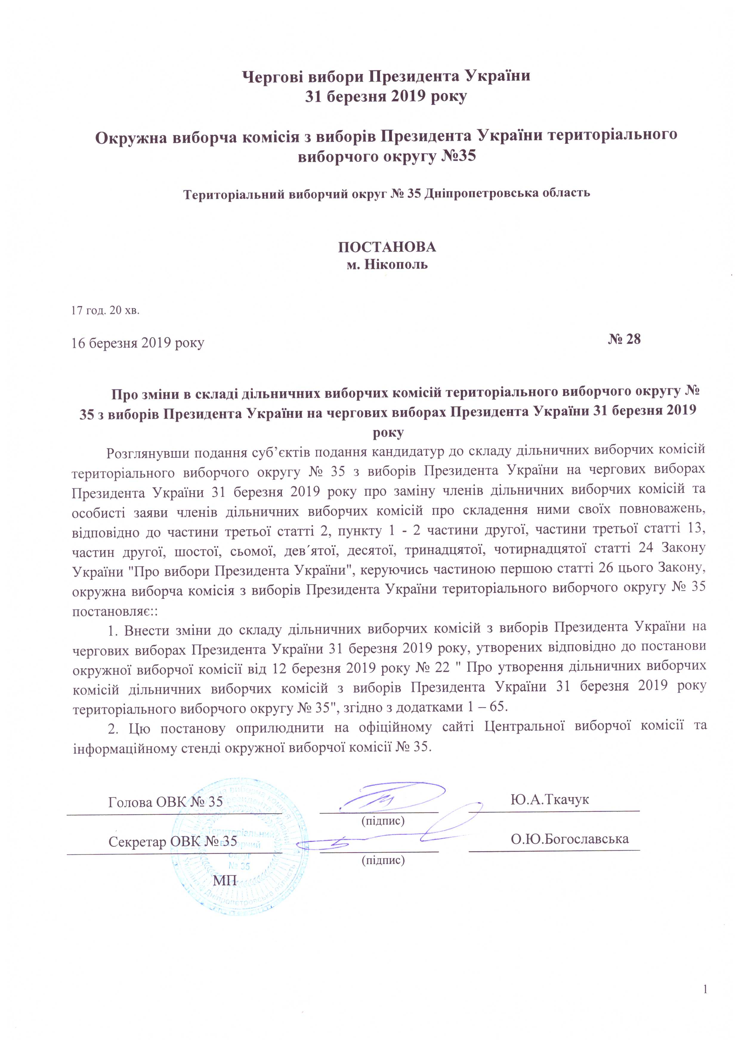 Про зміни в складі дільничних виборчіх комісій територіального виборчого округу №35 з виборів Президента України на чергових виборах Президента України 31 березня 2019 року |