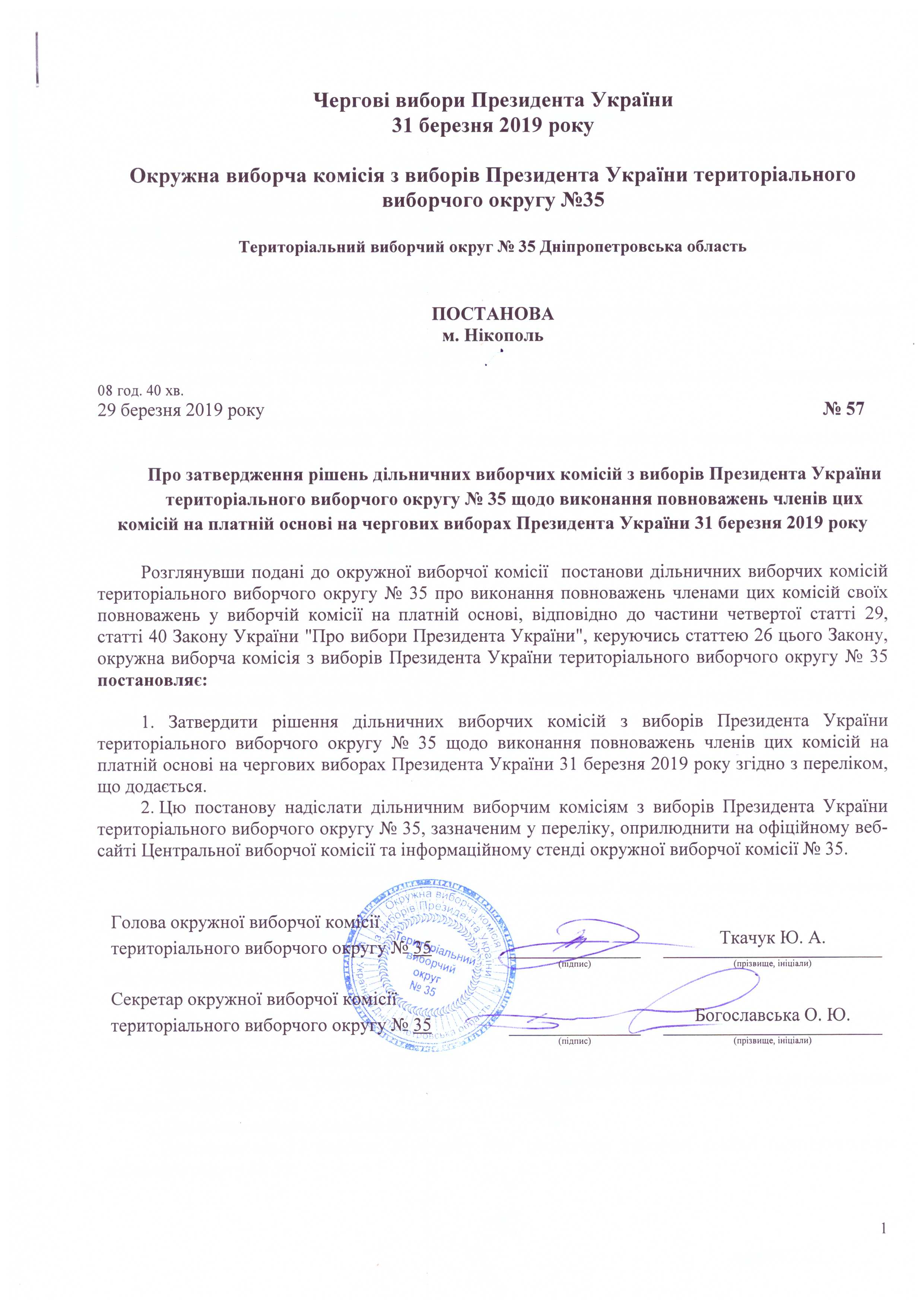 Про затвердження рішень дільничних виборчих комісій з виборів Президента України територіального виборчого округу № 35 щодо виконання повноважень членів цих комісій на платній основі на чергових виборах Президента України 31 березня 2019 року |