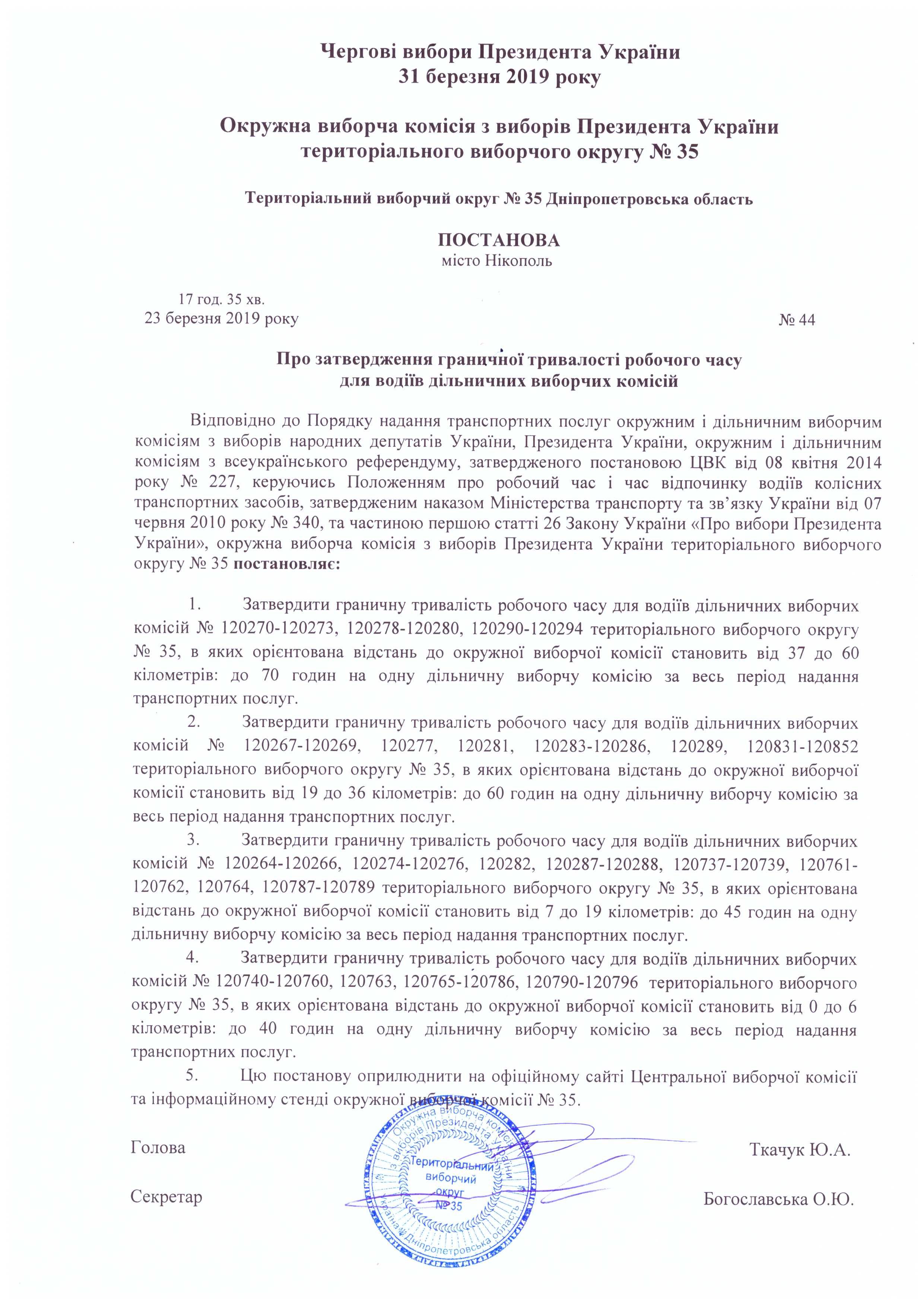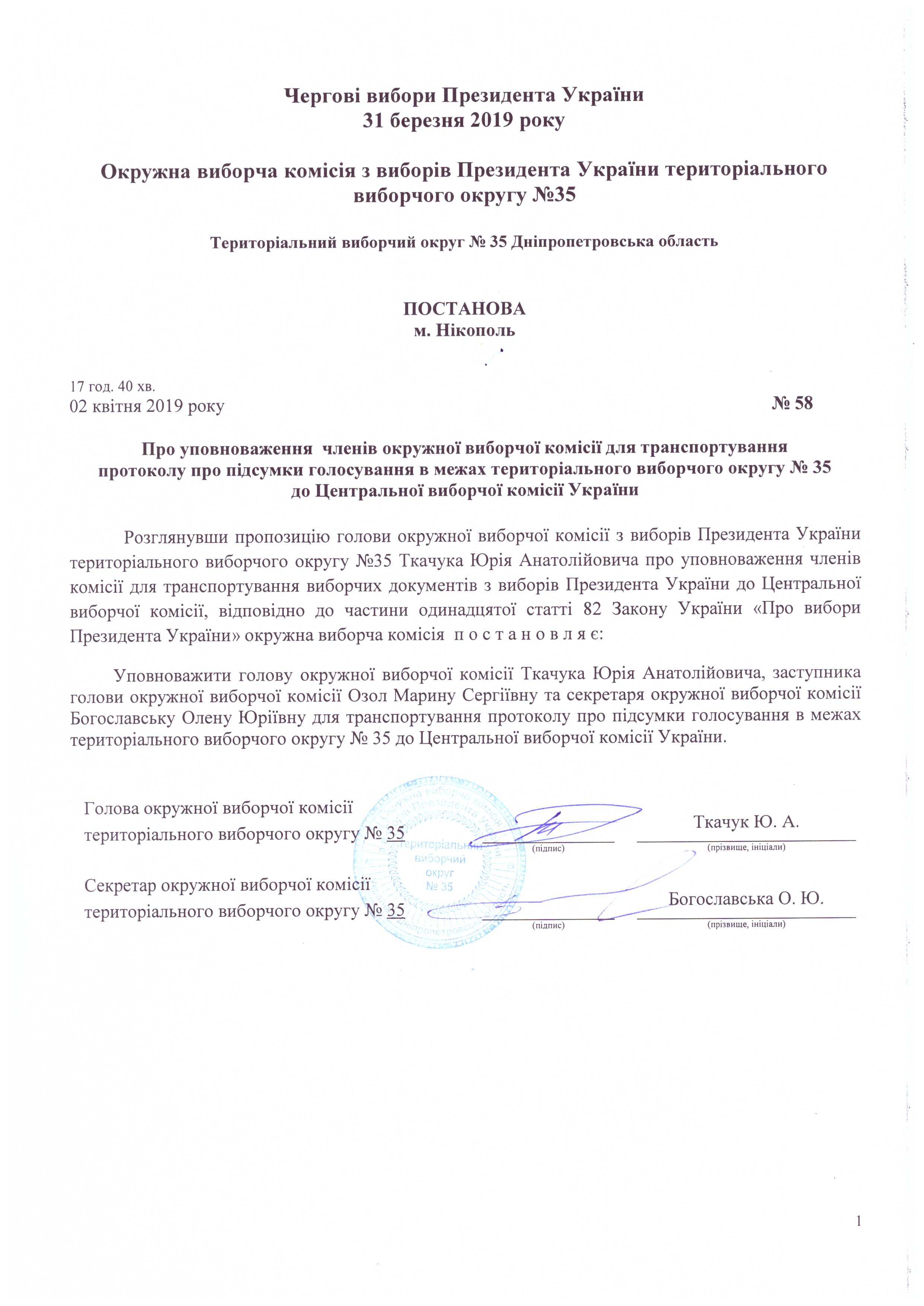 Про уповноваження членів окружної виборчої комісії для транспортування протоколу про підсумки голосування в межах територільного виборчого округу № 35 до Центральної виборчої комісії Украіни |