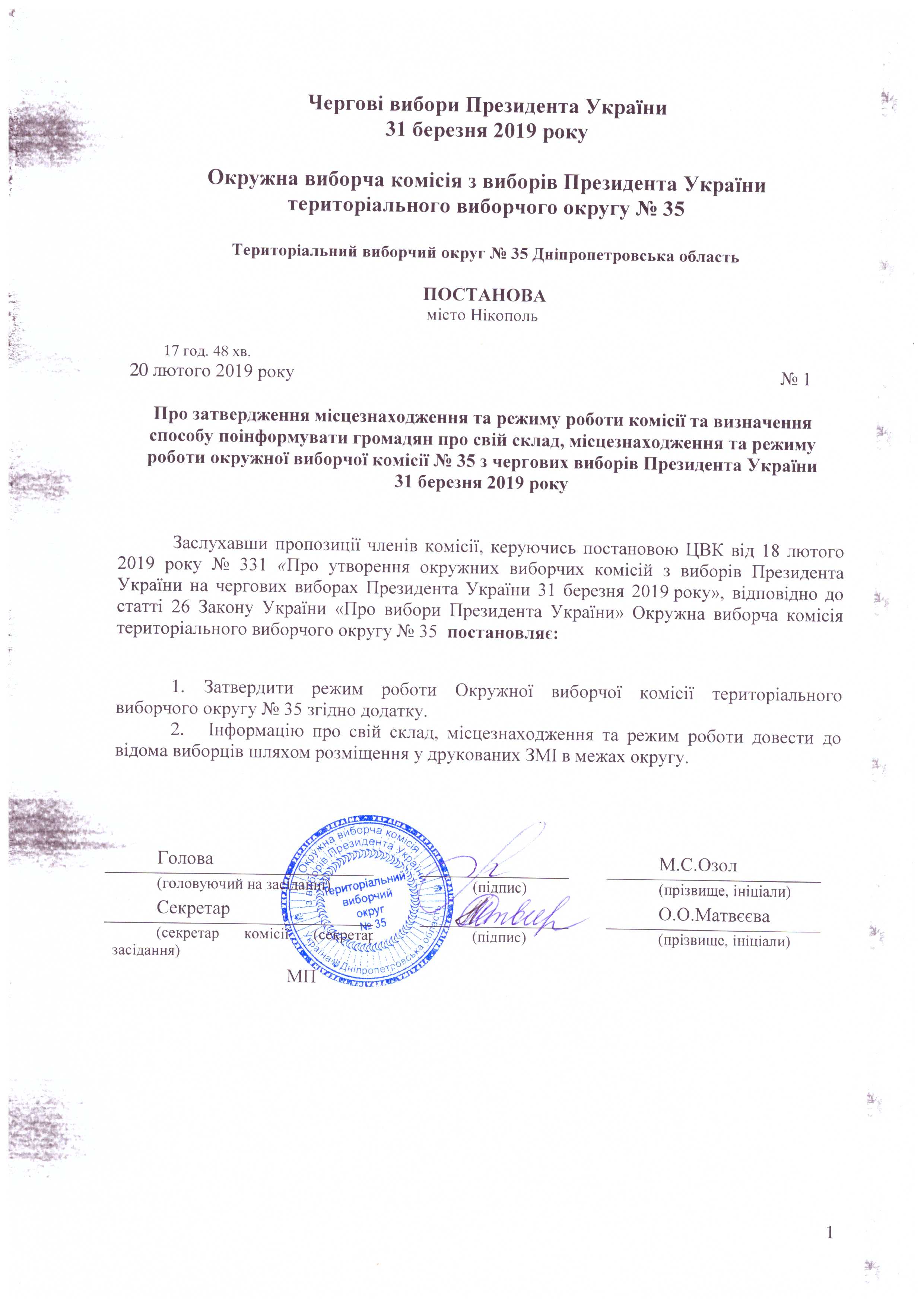 Про затвердження місцезнаходження та режиму роботи комісії та визначення способу поінформувати громадян про склад, місцезнаходження та режиму роботи окружної виборчої комісії № 35 з чергових виборів Президента України 31 березня 2019 року |