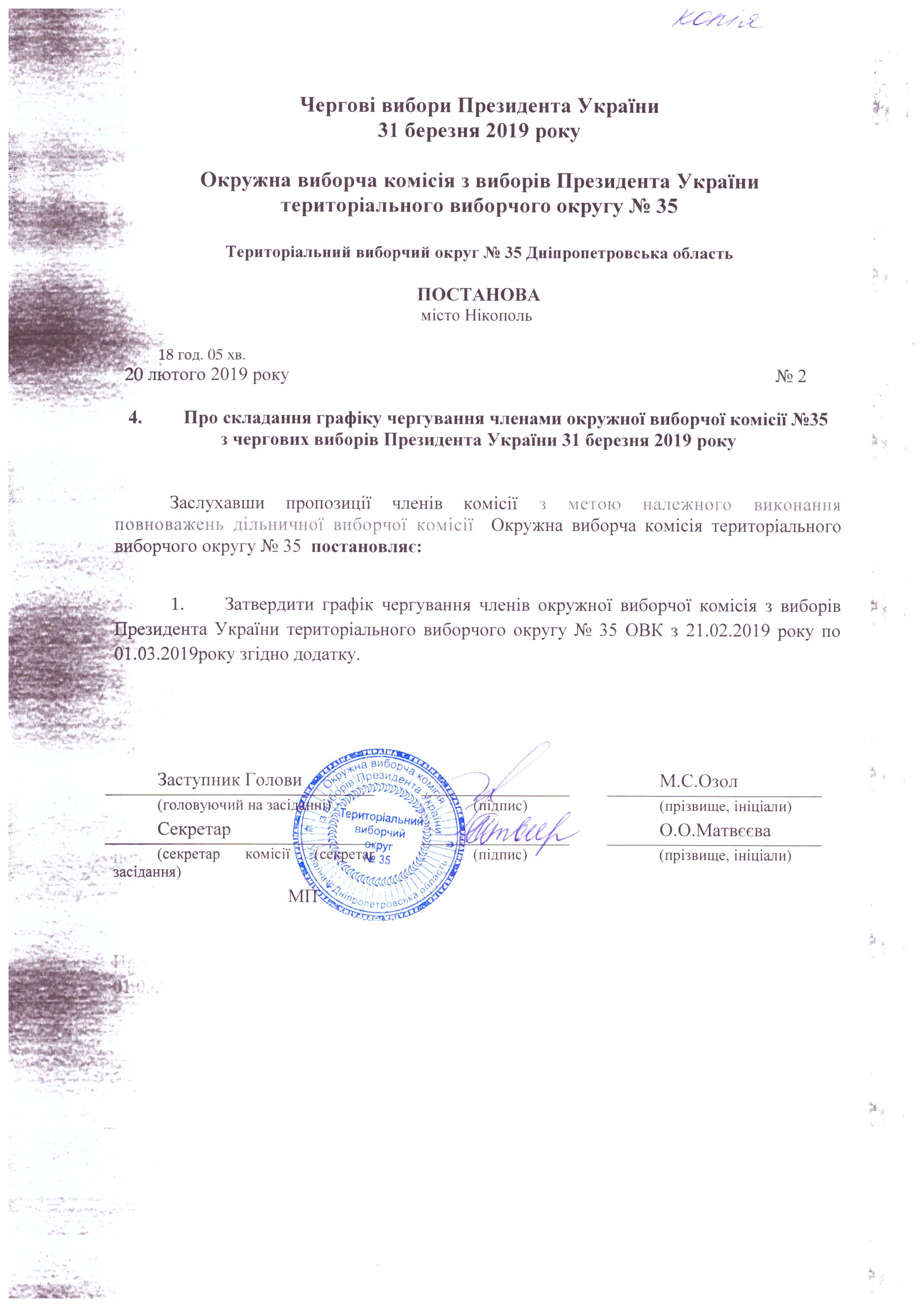 Про складання графіку чергування членами ОВК № 35 з чергових виборів Президента України 31 березня 2019 року |