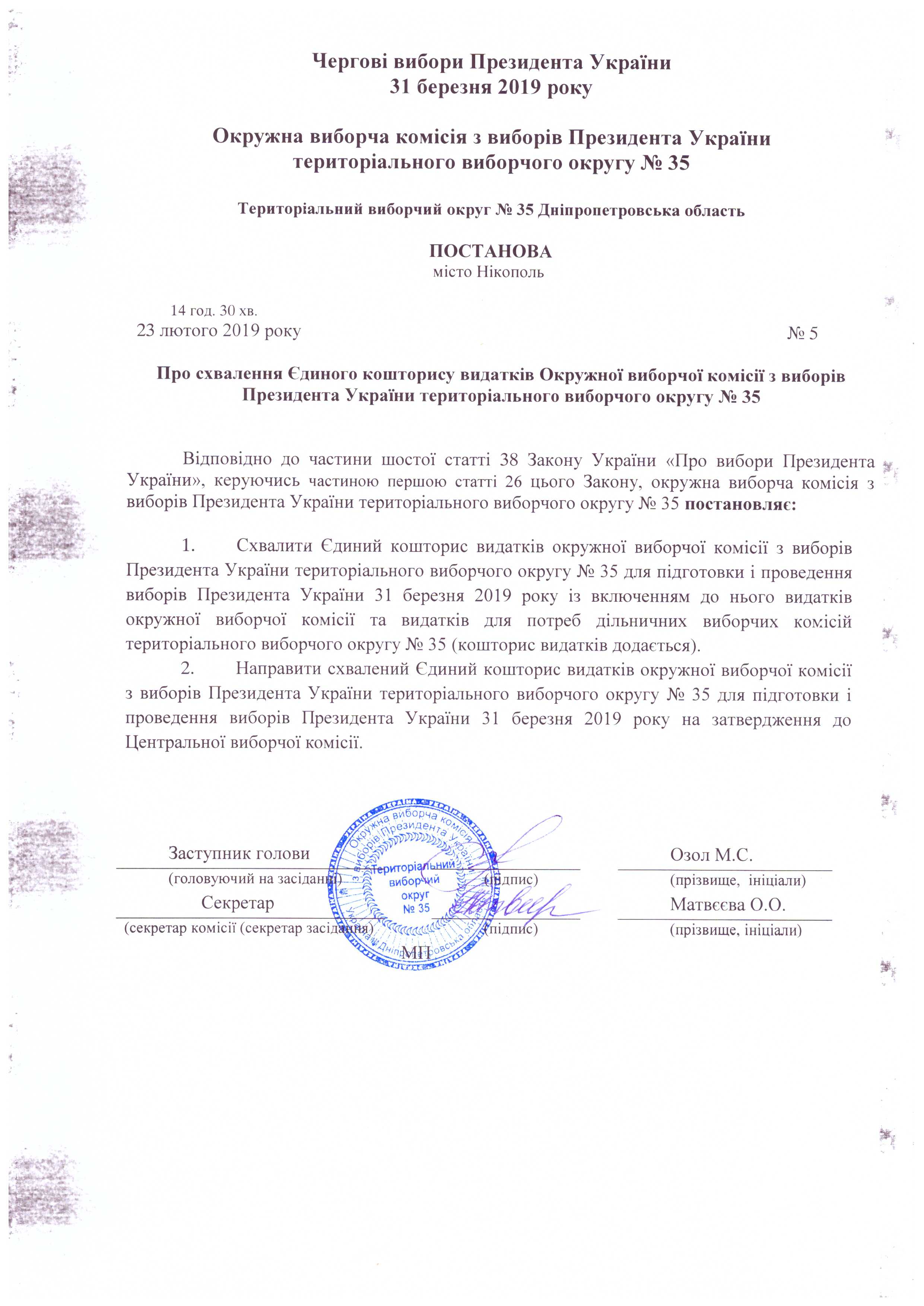 Про схвалення Єдиного кошторису видатків Окружної виборчої коміссії з виборів Президента України територіального виборчого округу №35 |