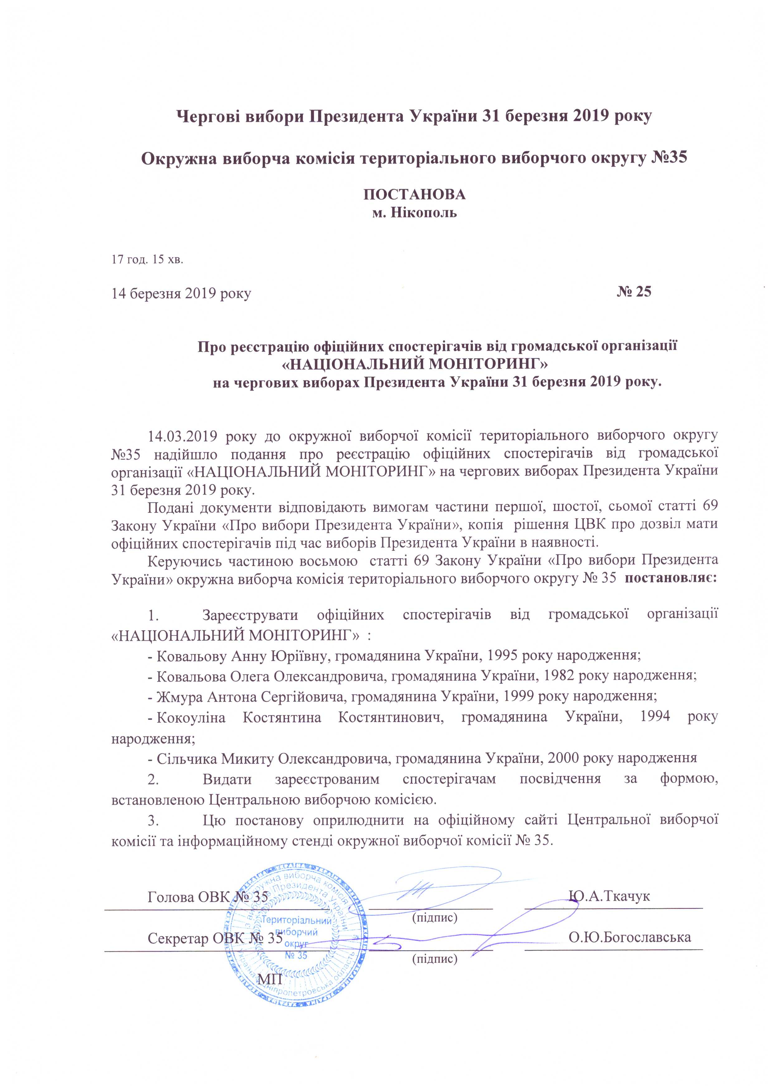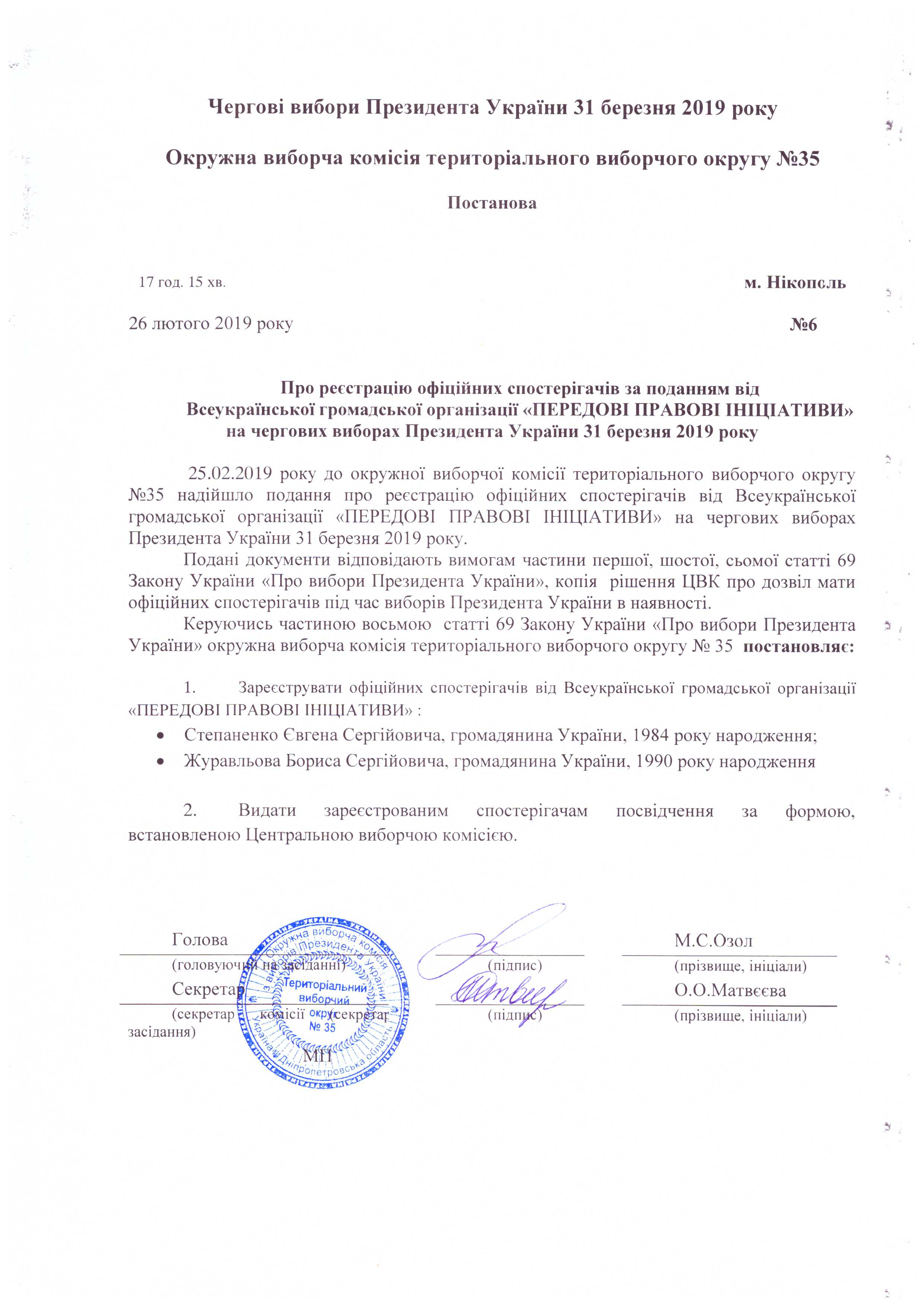 Про реєстрацію офіційних спостерігачів Всеукраїнської громадської організації "Громадська мережа "Опора" у територіальному виборчому окрузі №35 на чергових виборах Президента України 31 березня 2019 року |