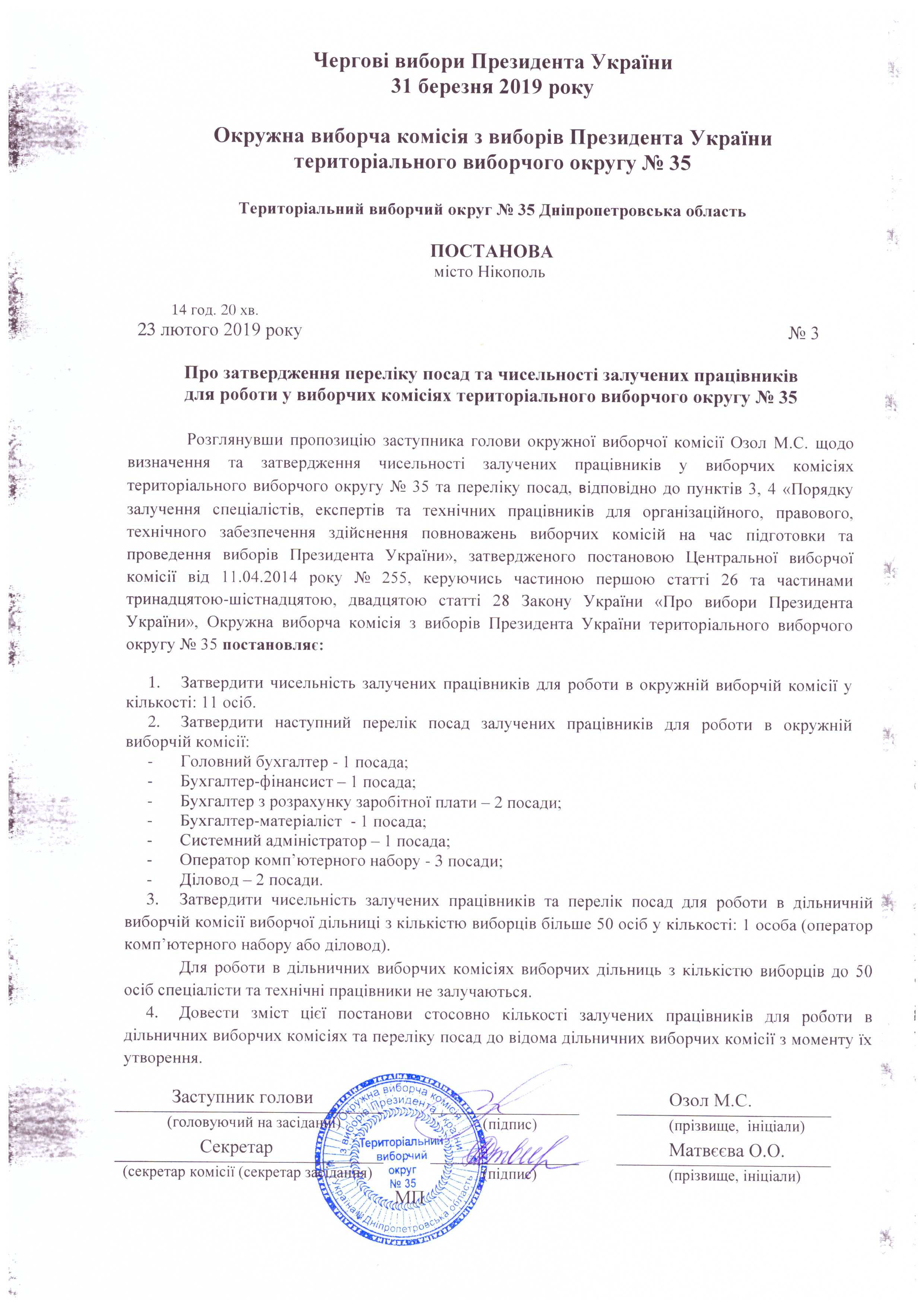 Про затвердження переліку посад та чисельності залучених працівників для роботи у виборчих комісіях теріторіального виборчого округу № 35 |