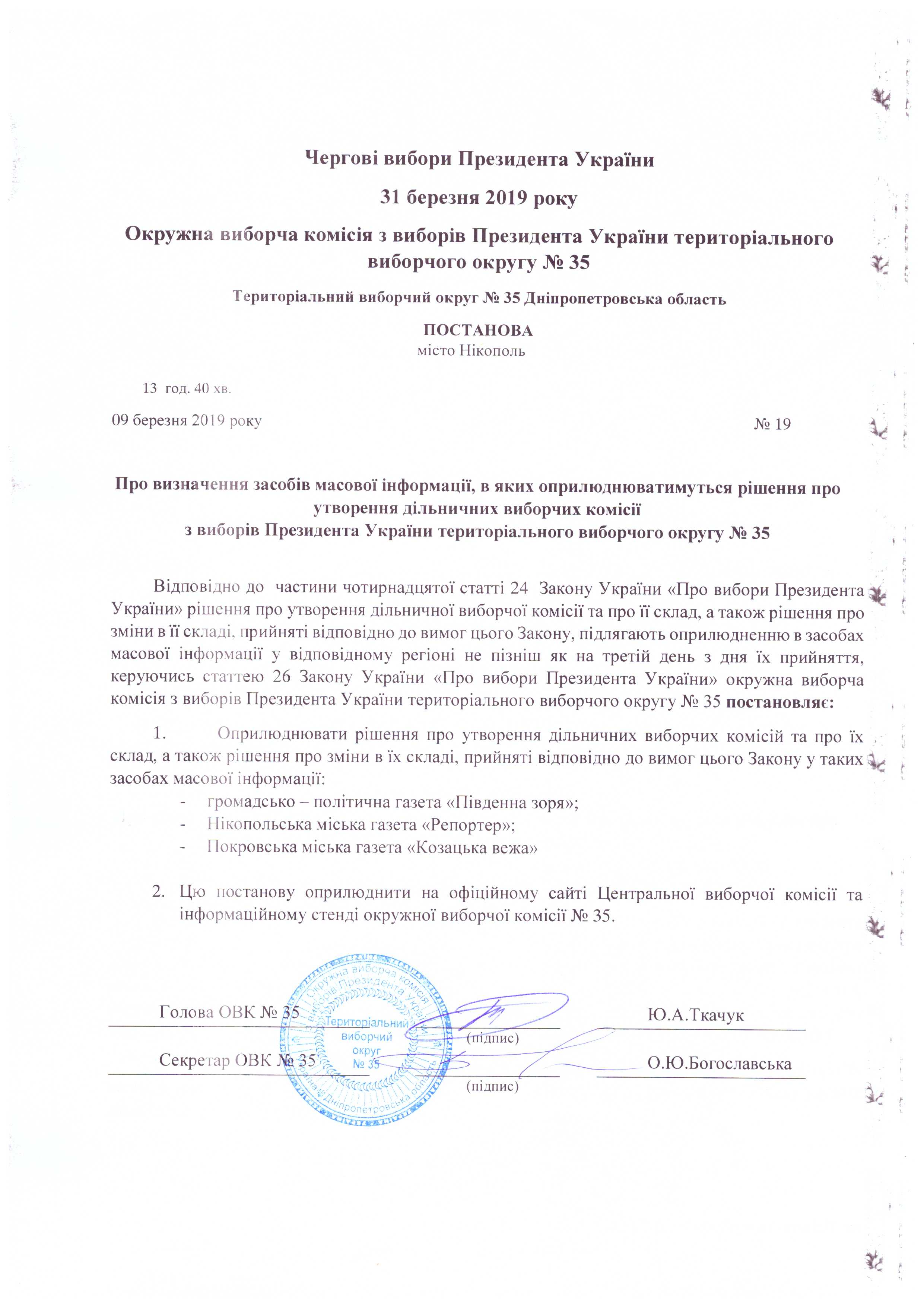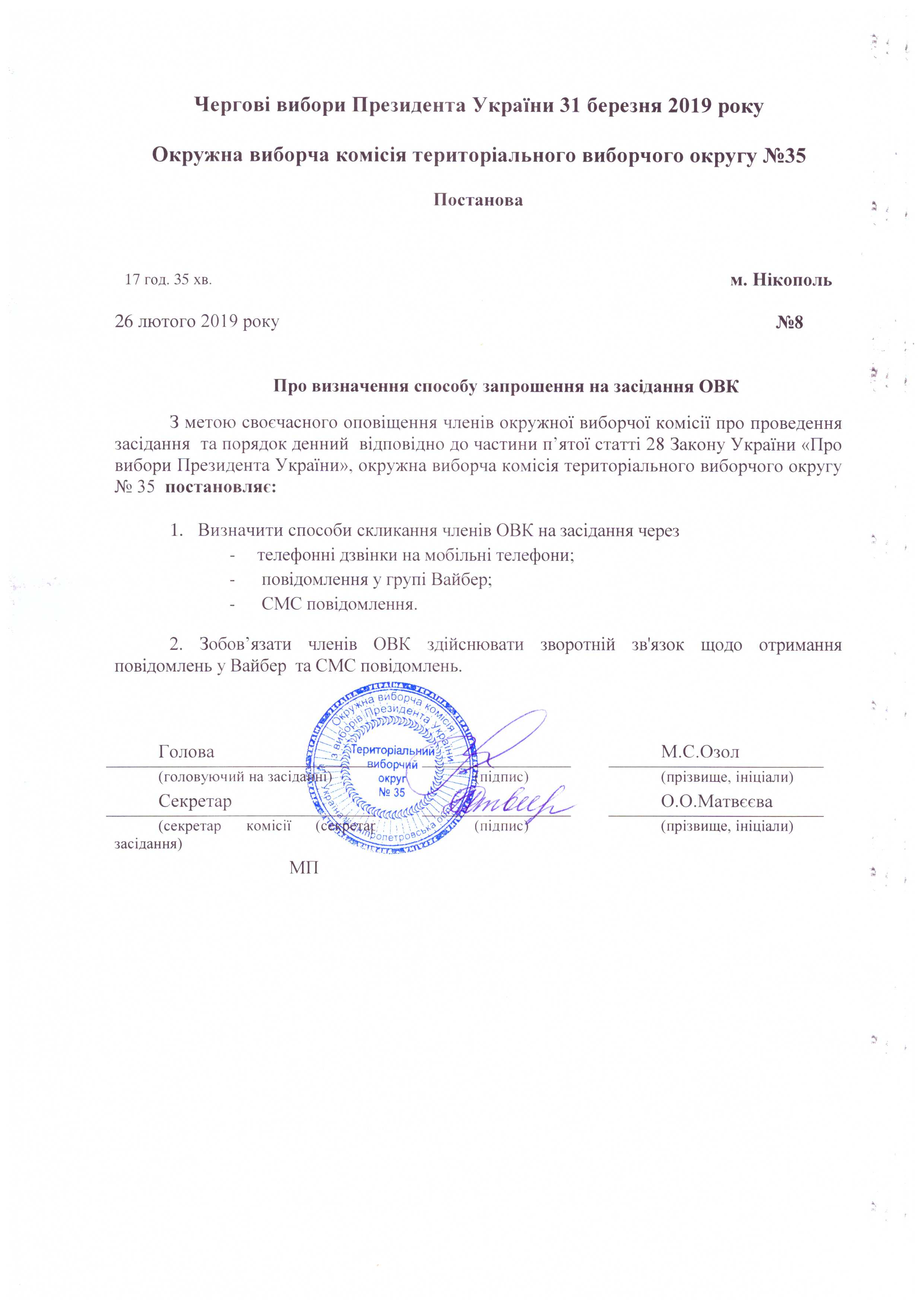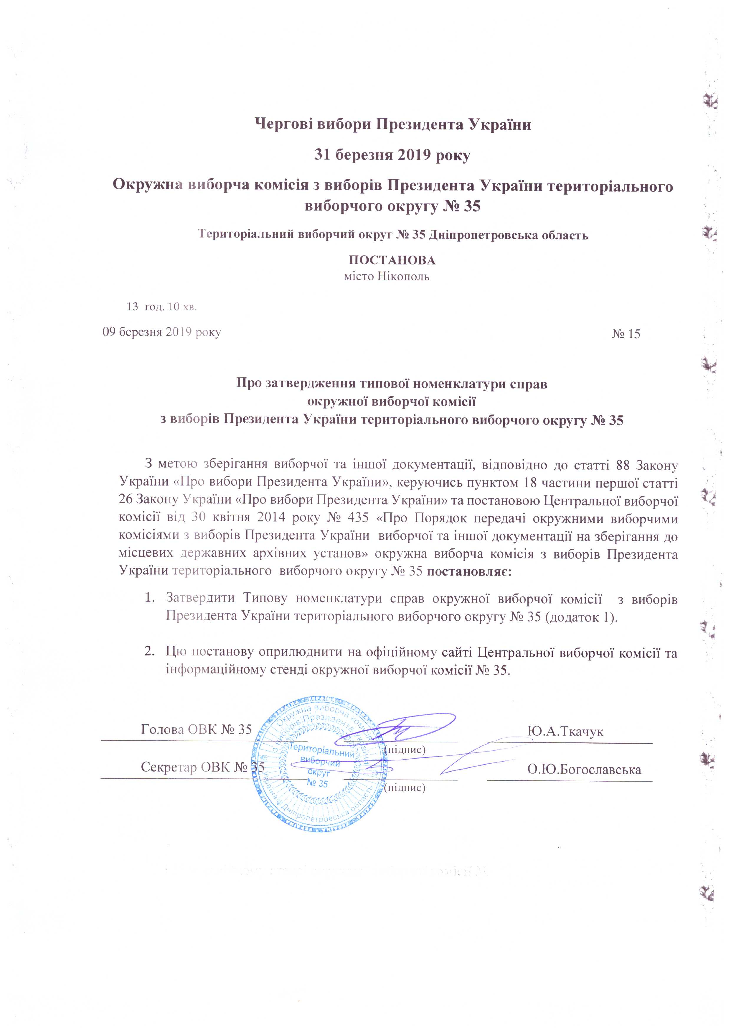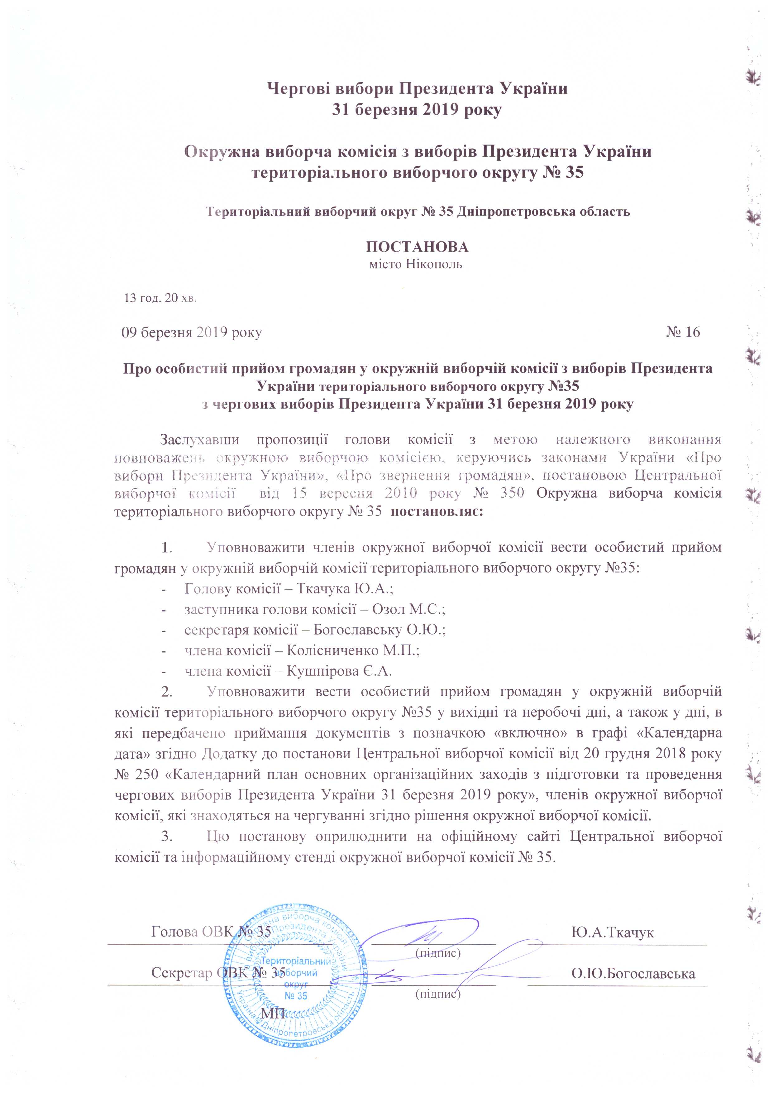 Про визначення членів ОВК № 35 з чергових виборів Президента України 31 березня 2019 року уповноважених приймати документи, заяви і скарги, що надійшли до ОВК |