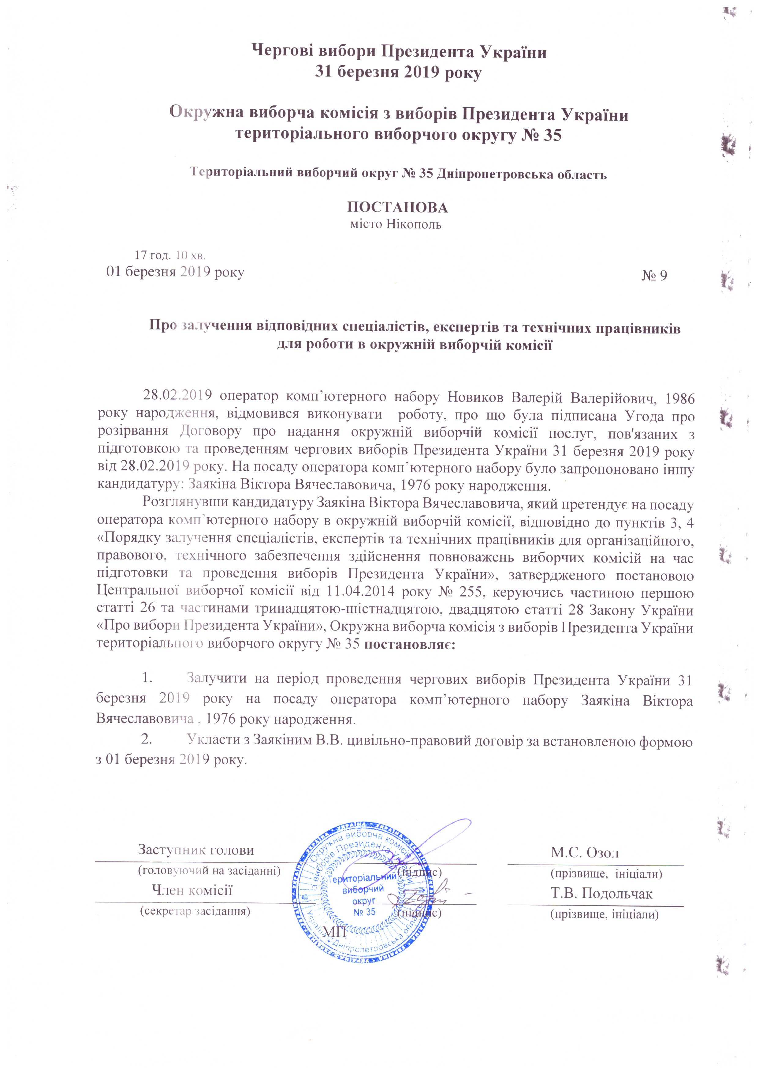 Про відхилення кандидатур, запропонованих окремими суб'єктами подання до скаладу дільничних виборчіх комісій з виборів Президента України 31 березня 2019 року територіального виборчого округу №35 |
