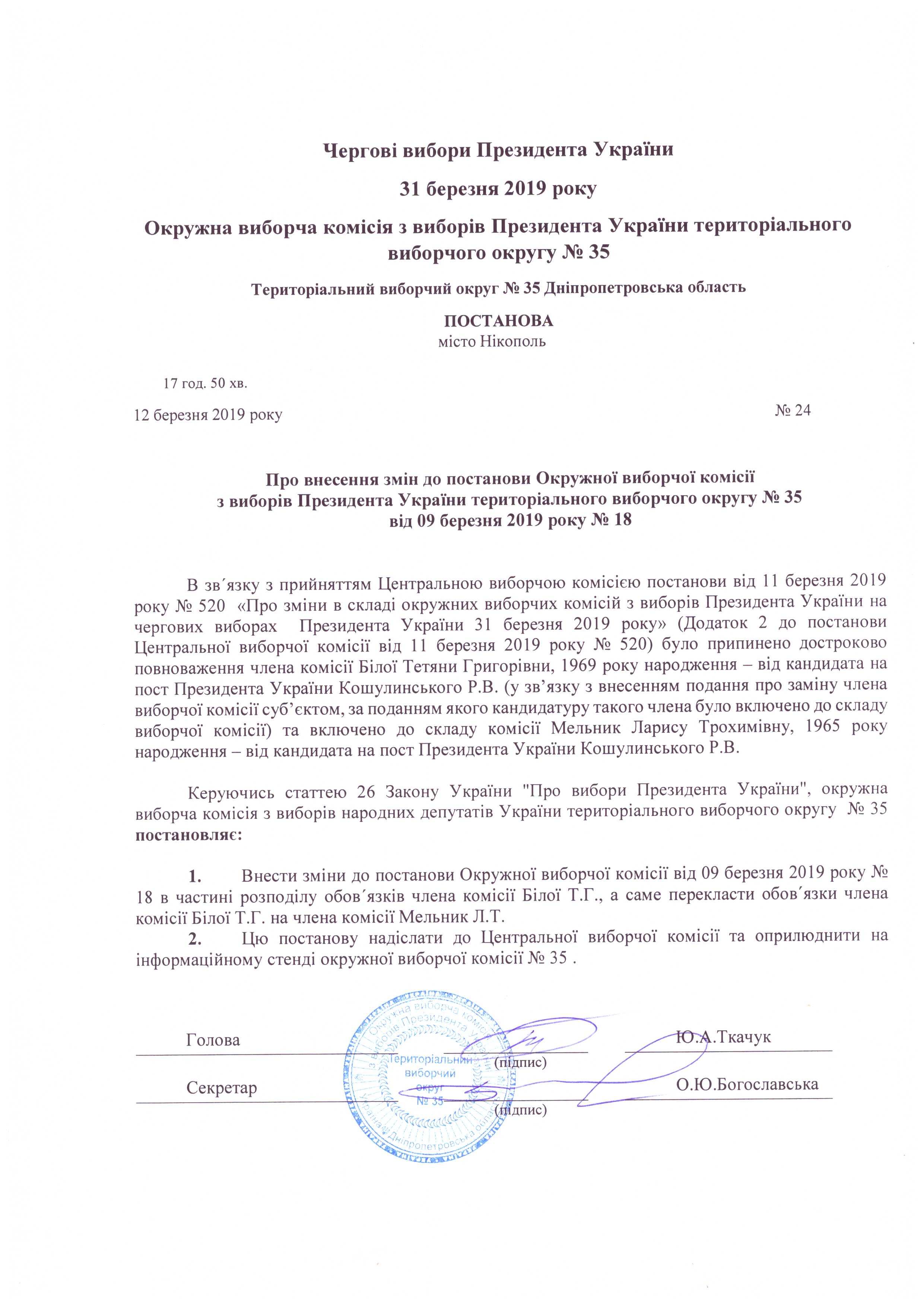 Про перерозподіл між членами Окружної виборчої комісії з виборів Президента України територіального виборчого округу №35 кураторства над дільничними виборчими комісіями в межах округу на виборах Президента України 31 березня 2019 року |