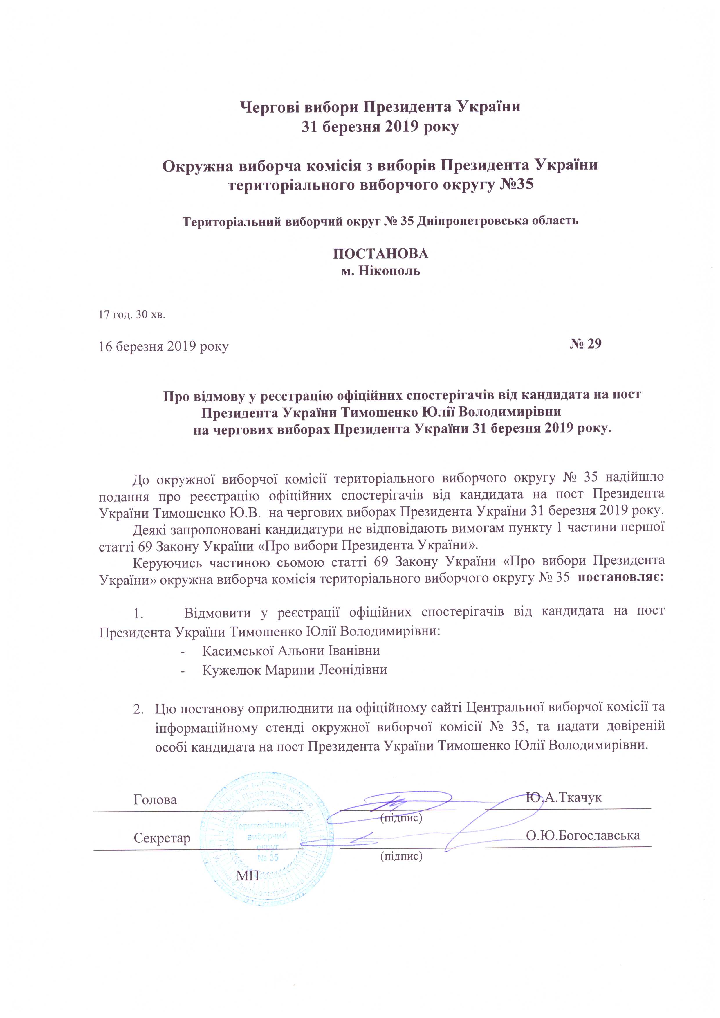 Про відмову у реєстрації офіційних спостерігачів від кандидата на пост Президента України Тимошенко Юлії Володимирівни на чергових виборах Президента України 31 березня 2019 року |