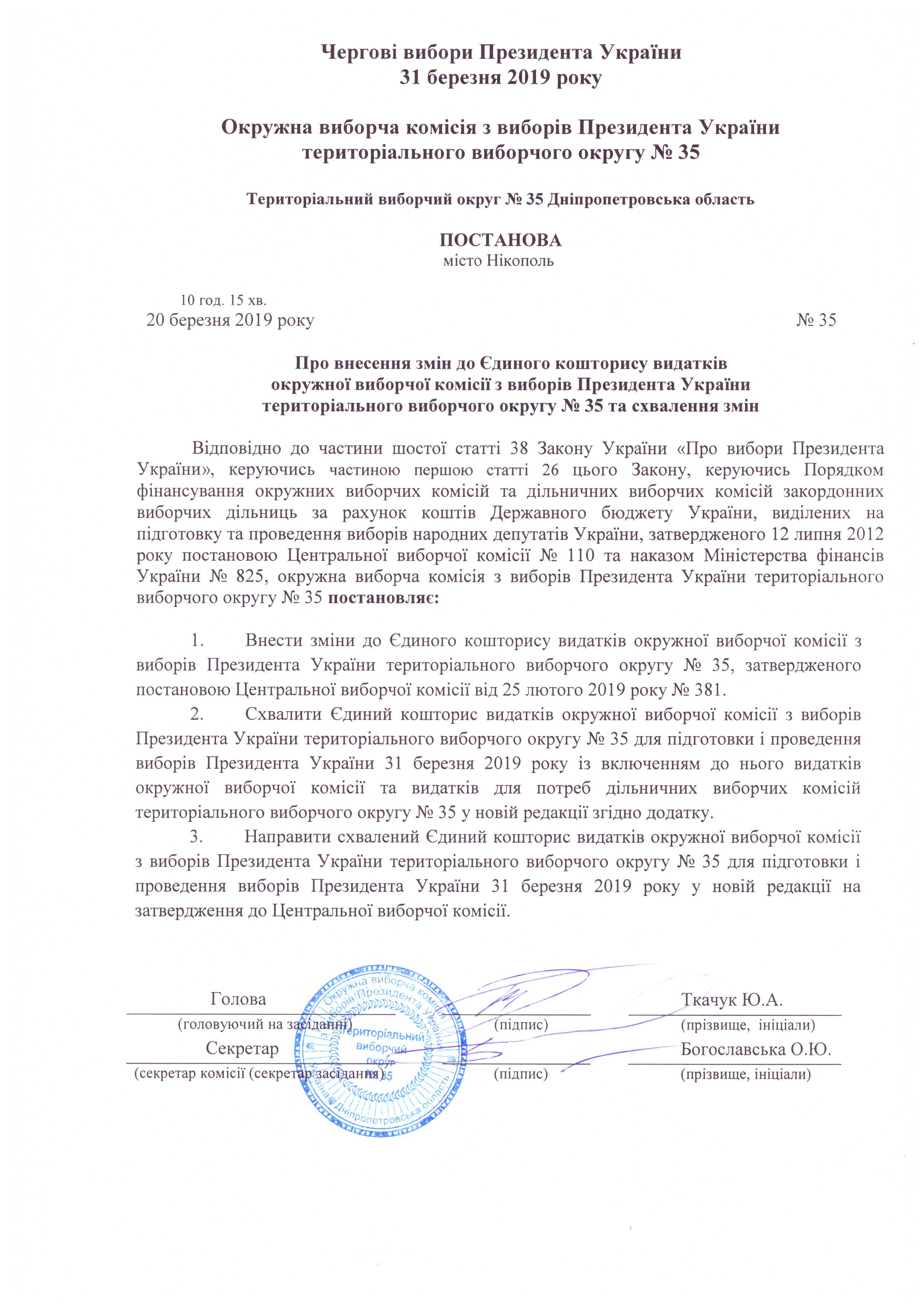 Про внесення змін до Єдиного кошторису видатків окружної виборчої комісії з виборів Президента України територіального виборчого округу № 35 та схвалення змін |