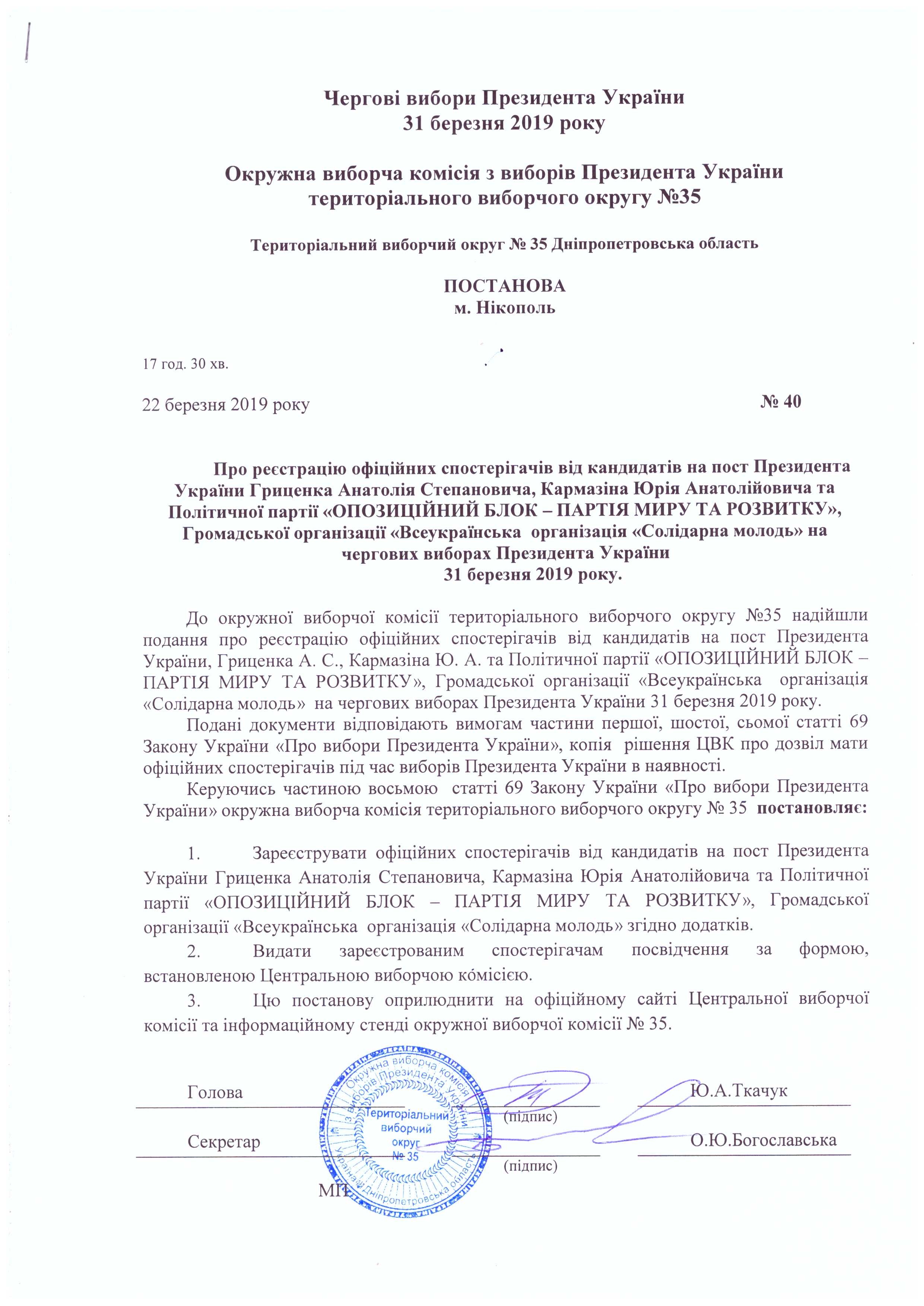 Про рєестрацію офіційних спостерігачів від кандидатів на пост Президента України Гриценка Анатолія Степановича, Кармазіна Юрія Анатолійовича та Політичної партії "ОПОЗИЦІЙНИЙ БЛОК - ПАРТІЯ МИРУ ТА РОЗВИТКУ", Громадської організації "Всеукраїнська організація "Солідарна молодь" на чергових виборах президента України 31 березня 2019 року |