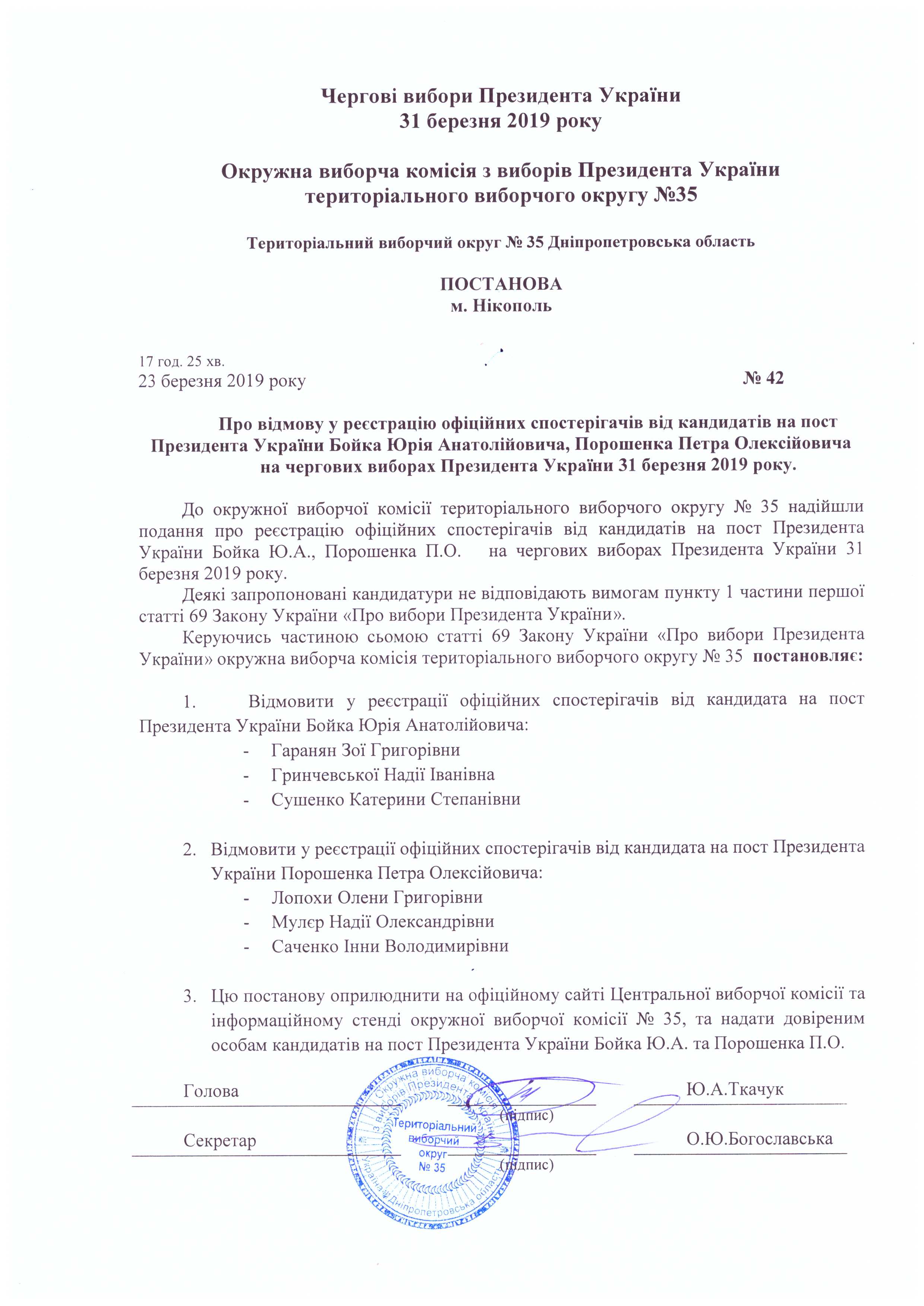 Про відмову у реєстрації офіційних спостерігачів від кандидатів на пост Президента України бойка Юрія Анатолійовича, Порошенка Петра Олексійовича на чергових виборах президента України 31 березня 2019 року |