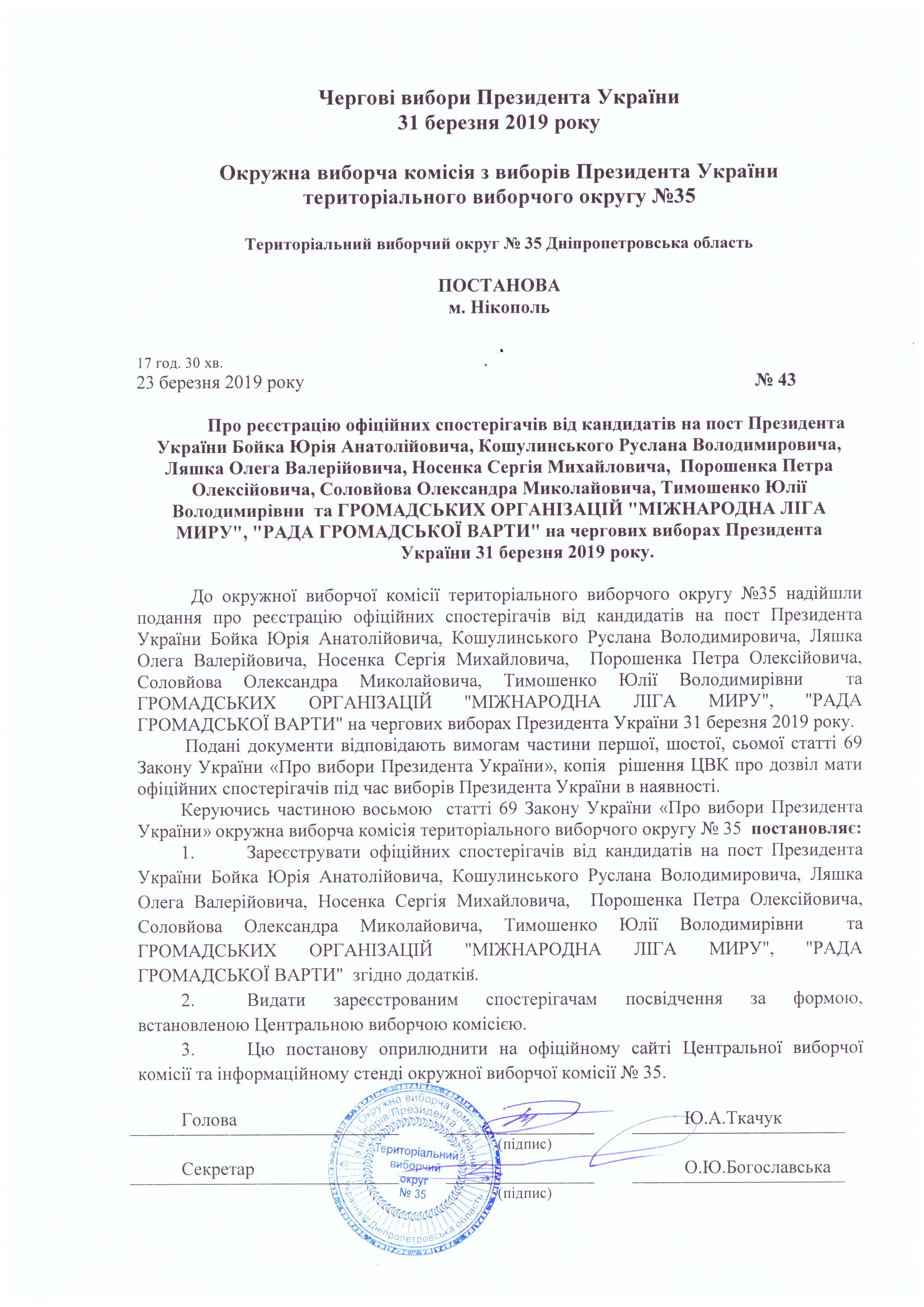 Про реєстрацію офіційних спостерігачів від кандидатів на пост Президента УкраїниБойка Юрія Анатолійовича, Кошулинського Руслана Володимировича, Ляшка Олега Валерійовича, носенка Сергія Михайловича, Порошенка Петра Олексійовича, Соловйова Олександра Миколайовича, Тимошенко Юлії Володимирівни та ГРОМАДСЬКИХ ОРГАНІЗАЦІЙ "МІЖНАРОДНА ЛІГА МИРУ", "РАДА ГРОМАДСЬКОЇ ВАРТИ" на чергових виборах президента України 31 березня 2019 року |