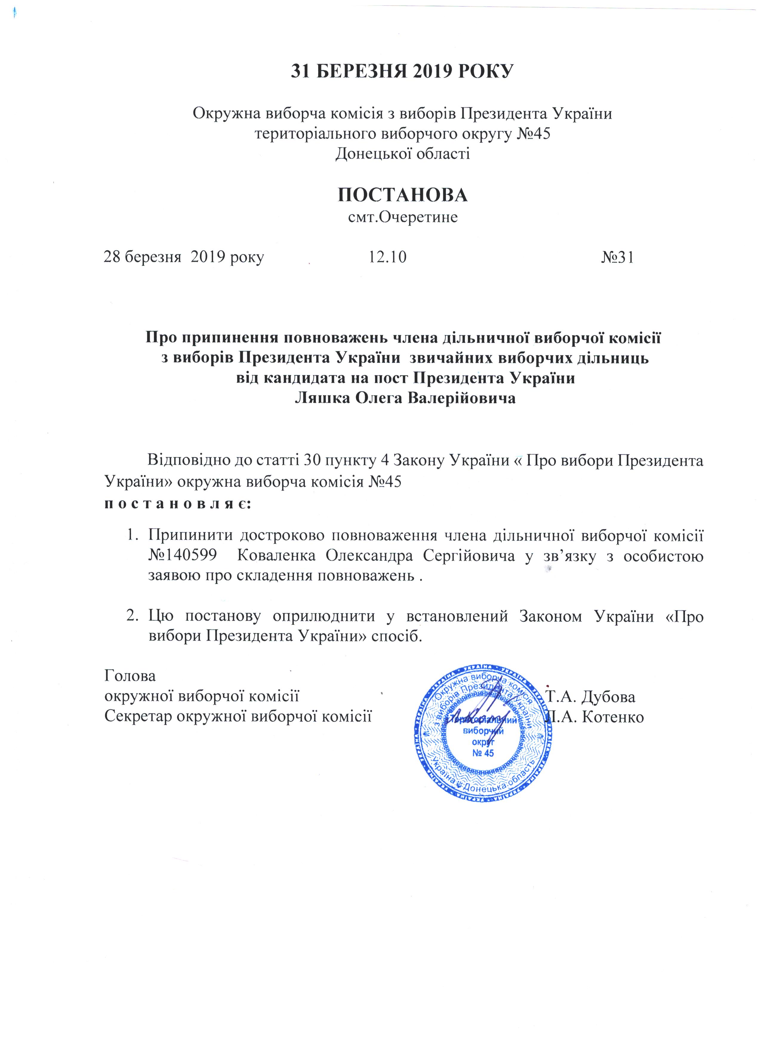 Про припинення повноважень члена дільничної виборчої комісії з виборів Президента України звичайних виборчих дільниць від кандидата на пост Президента України Ляшка Олега Валерійовича |