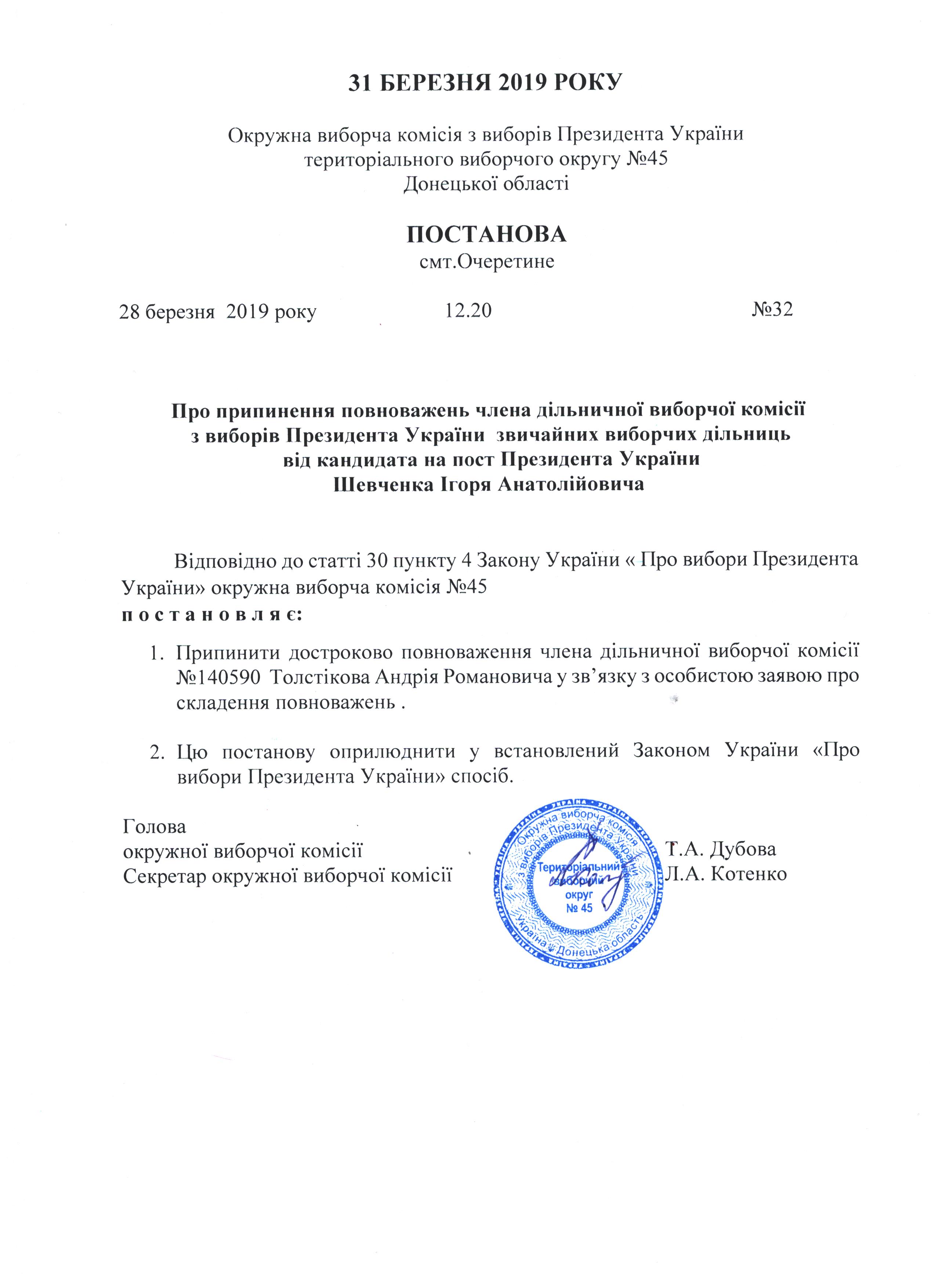 Про припинення повноважень члена дільничної виборчої комісії з виборів Президента України звичайних виборчих дільниць від кандидата на пост Президента України Шевченка Ігоря Анатолійовича |