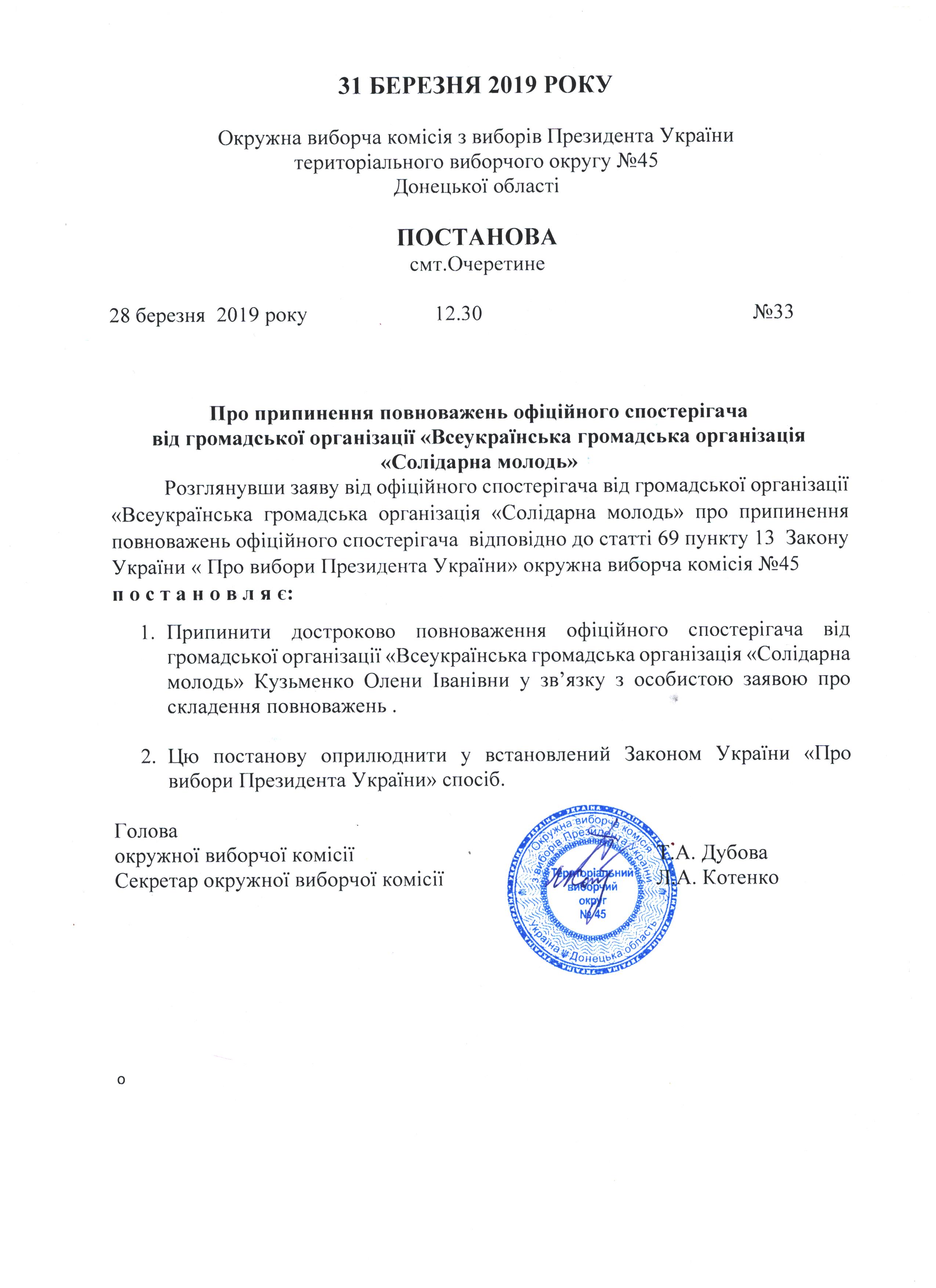 Про припинення повноважень офіційного спостерігача від громадської організації "Всеукраїнська громадська організація "Солідарна молодь" |