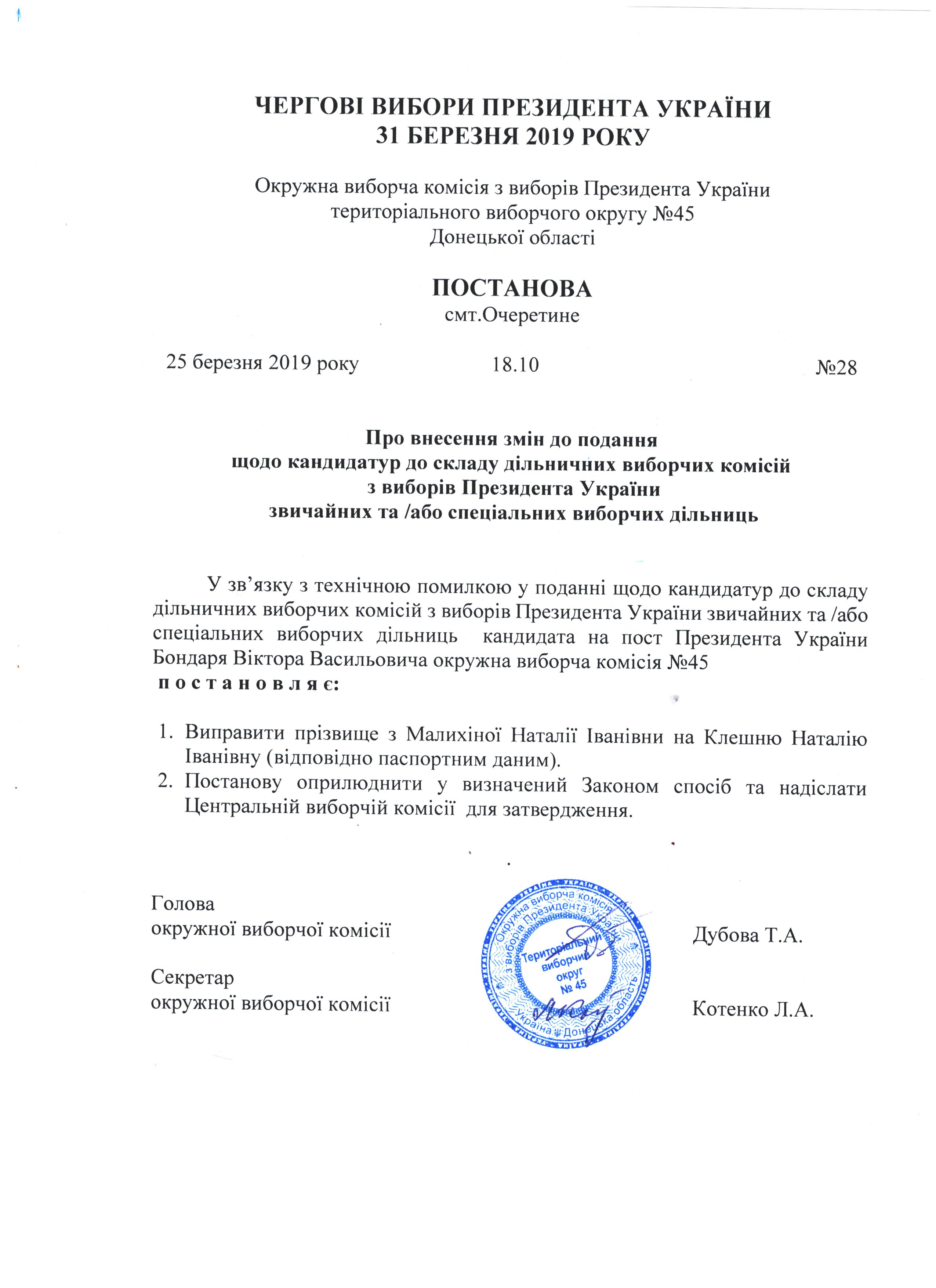 Про заміну членів дільничних виборчих комісій з виборів Президента України звичайних виборчих дільниць від кандидата на пост Президента України Бондаря Віктора Васильовича |