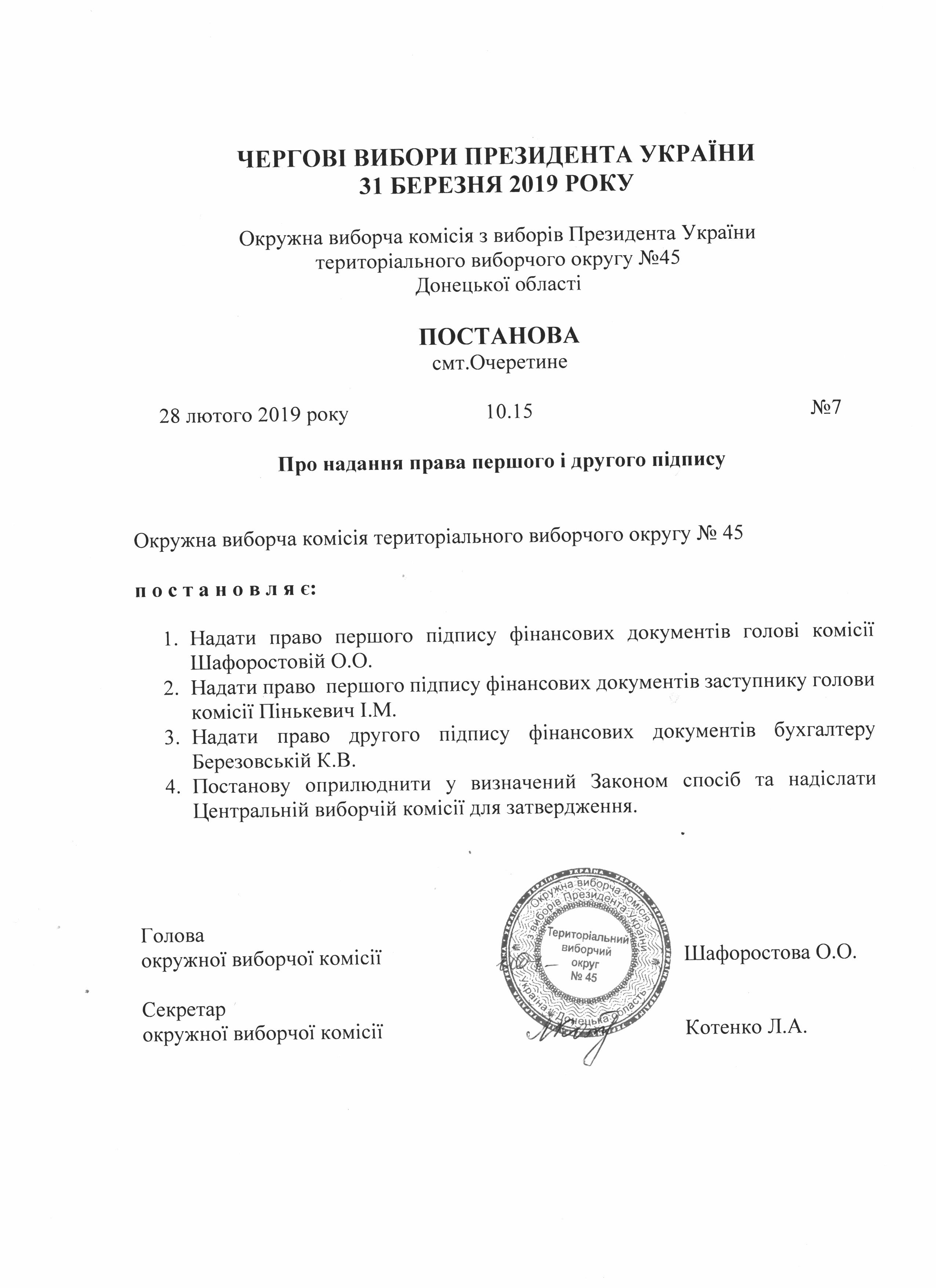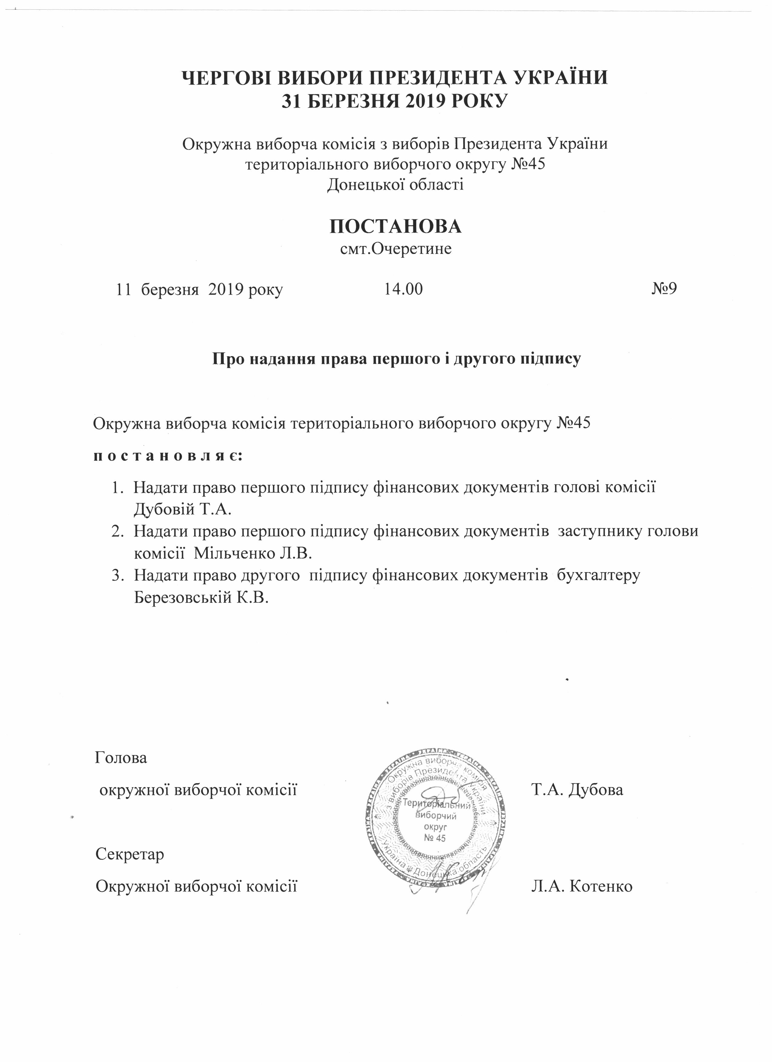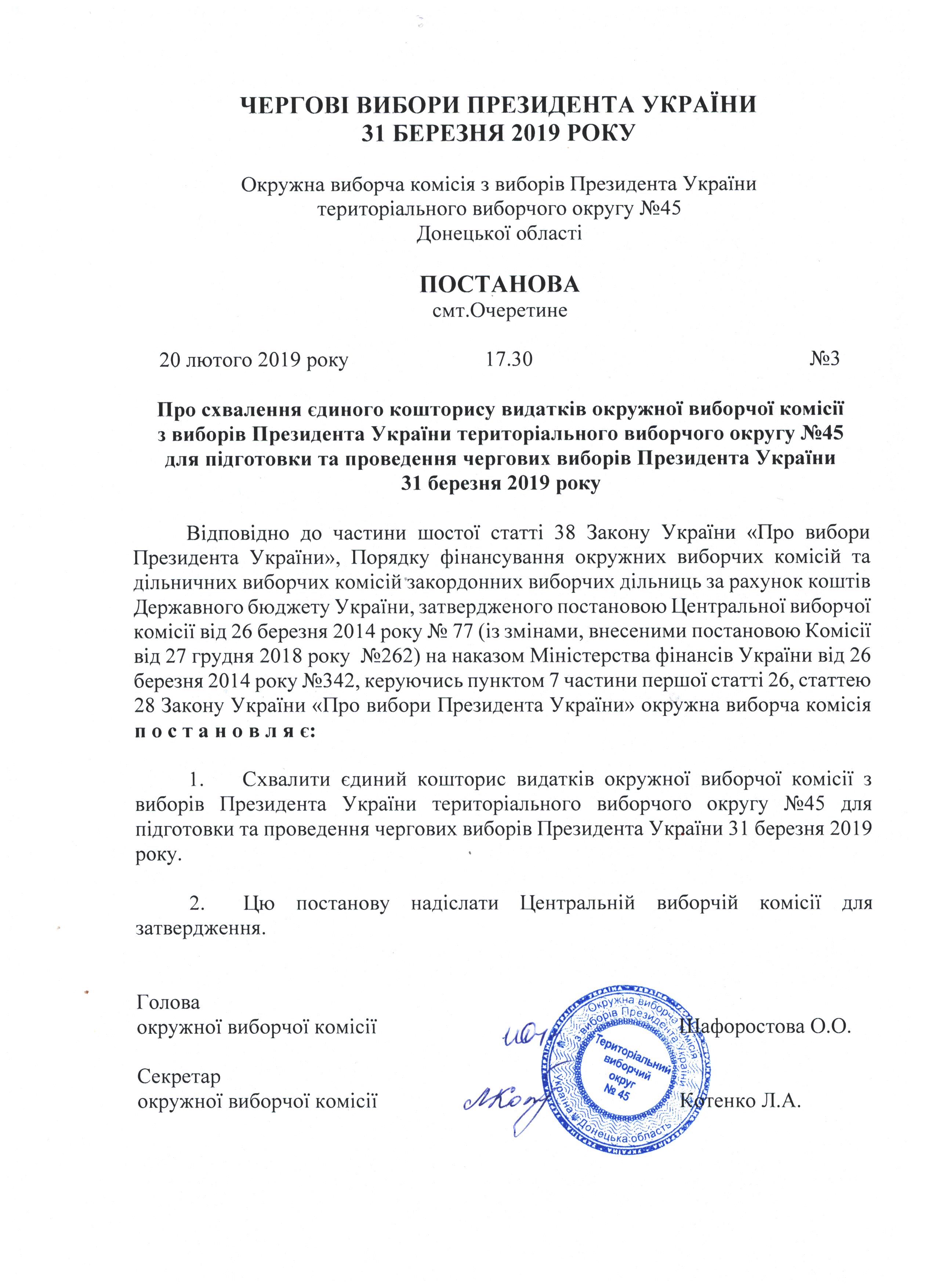 Про схвалення єдиного кошторису видатків окружної виборчої комісії з виборів Президента України територіального виборчого округу №45 для підготовки та проведення чергових виборів Президента України 31 березня 2019 року |